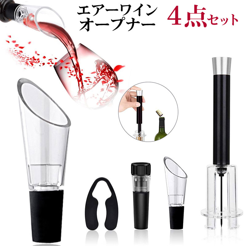 ワイングッズセット4点セットエアーワインオープナーバキュームストッパーワインポアラーホイルカッター翌日配達対応 宅配便配送 送料無料