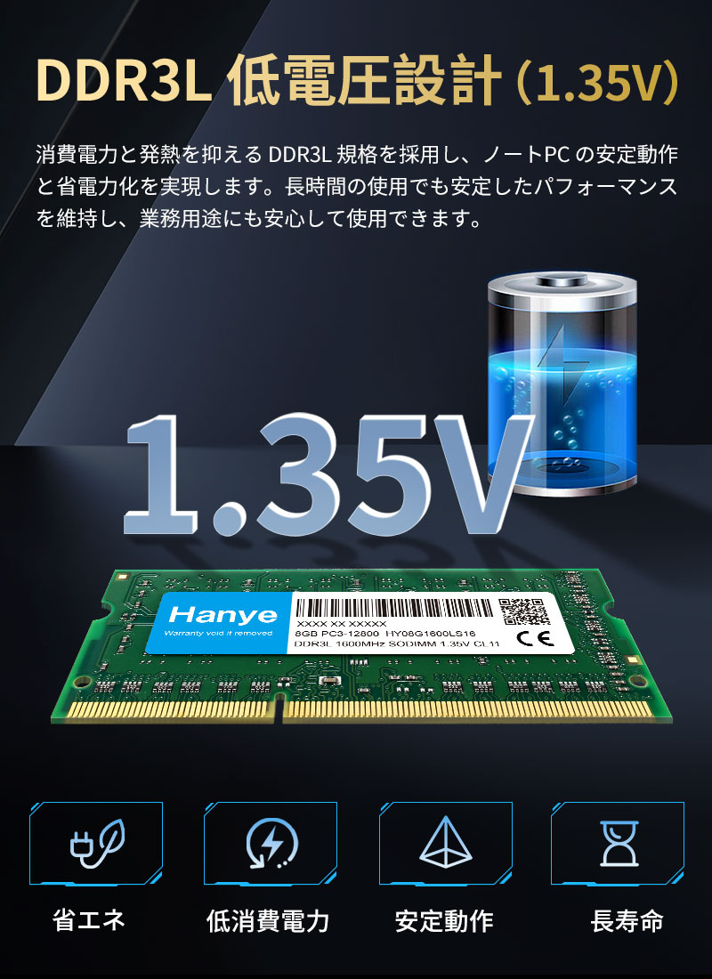 ノートPC用メモリ Hanye DDR3L 1600 PC3 12800 8GB(8GBx1枚) SODIMM 1.35V CL11 204 PIN 5年保証 翌日配達対応 送料無料