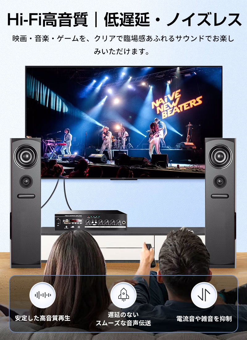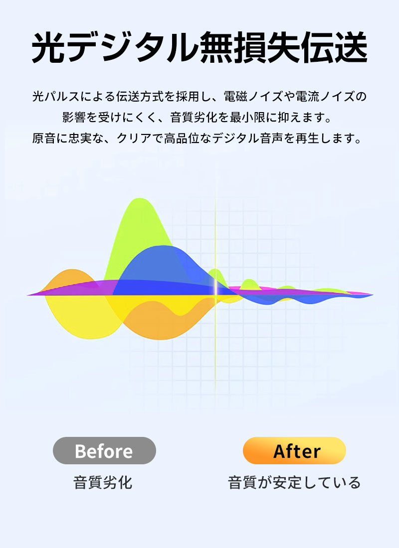 音声信号を光で伝送するため、電磁干渉や電流ノイズの影響を受けず、高音質・無遅延・ノイズレスな再生を実現します。