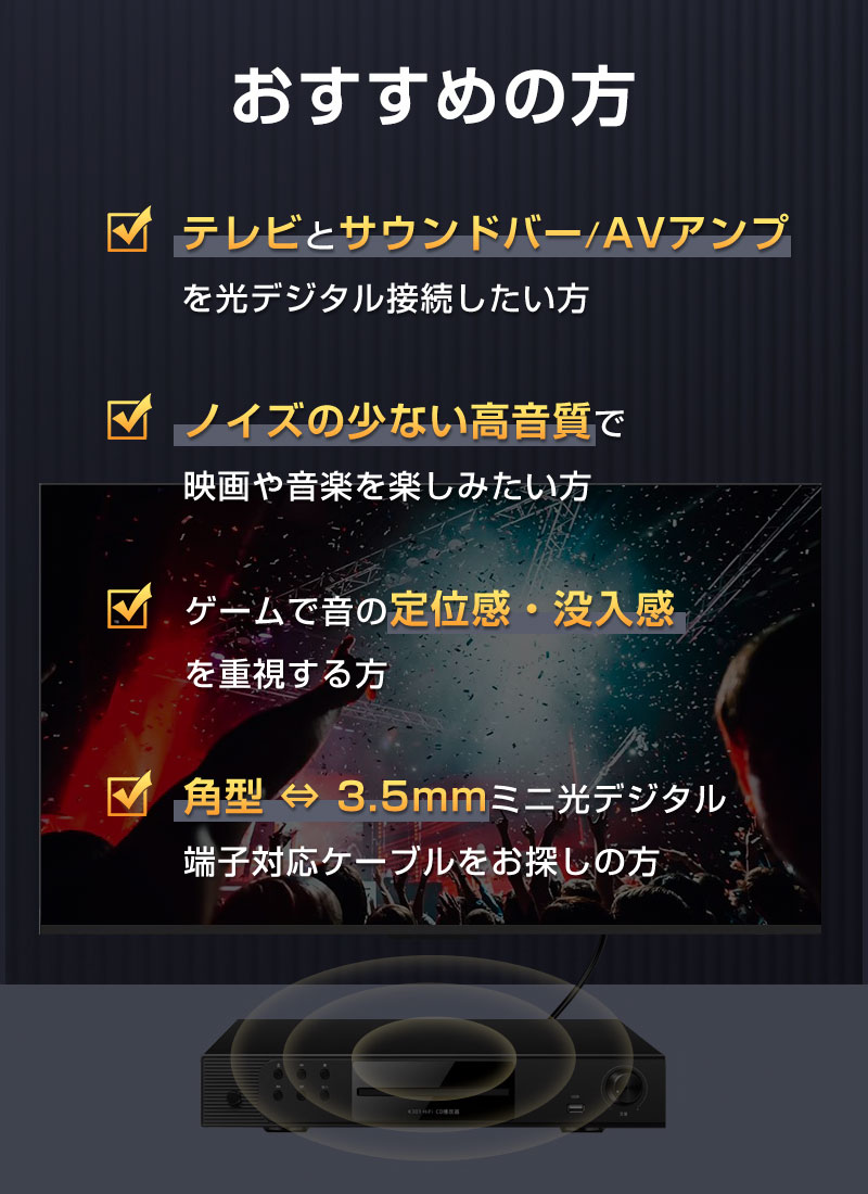 4.角型 ⇔ 丸型(3.5mm MINI TOSLINK)角型光デジタル出力と、3.5mm光デジタル入力を確実に接続します。※通常の3.5mmイヤホン端子には使用できません。