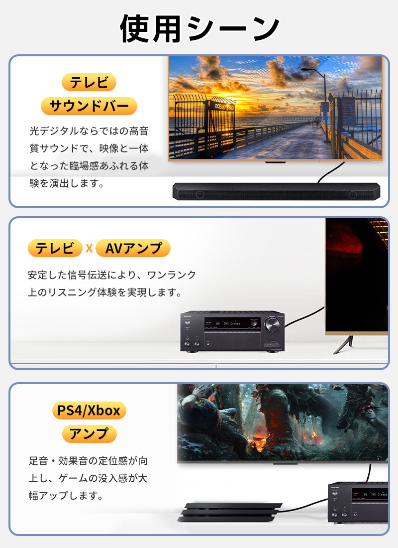 テレビ、サウンドバー、AVアンプ、PS4、ブルーレイプレーヤーなど幅広い機器に対応し、ご家庭で臨場感あふれるホームシアター・Hi-Fi環境を手軽に構築できます。