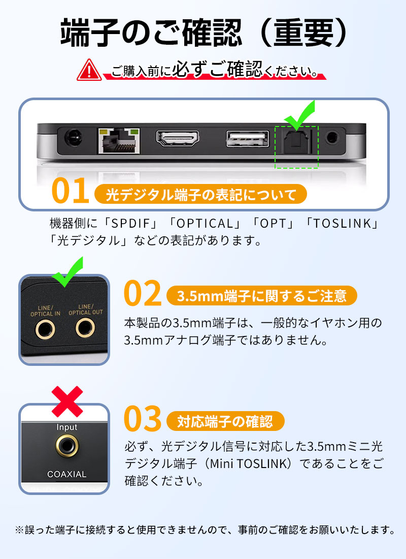 *3.5mm端子は、光デジタル信号対応のMini TOSLINK端子であることをご確認ください。