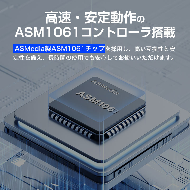信頼性の高い ASM1061コントローラ を搭載し、高速かつ安定したデータ転送を実現します。
