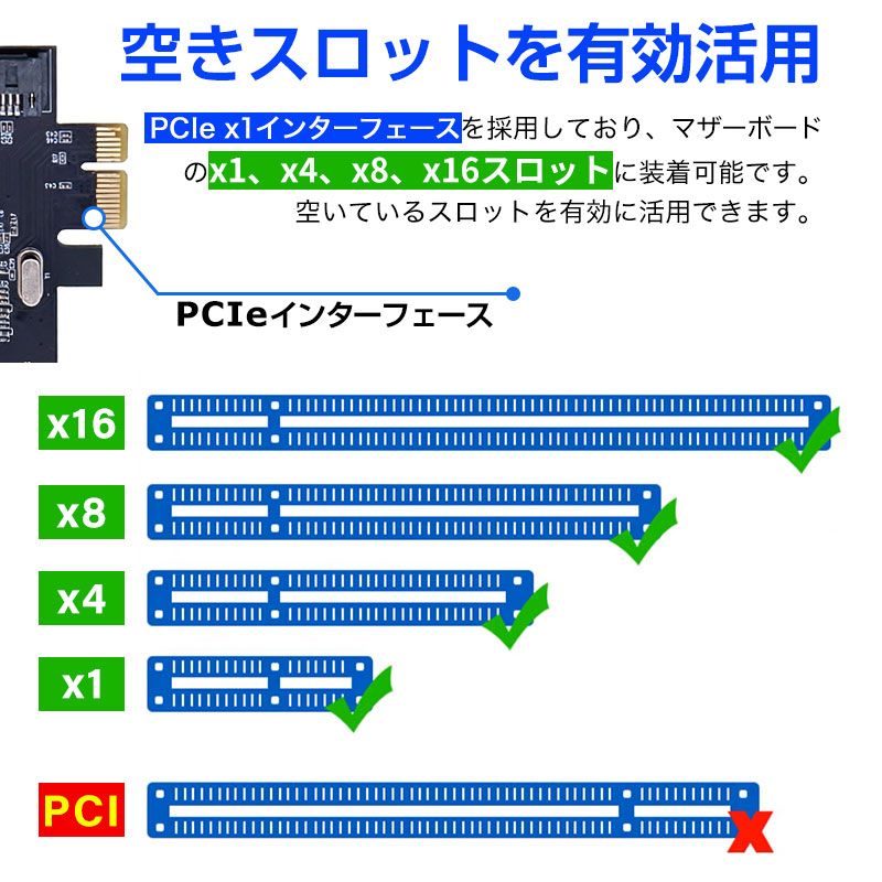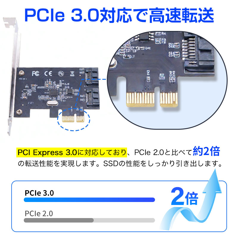 本製品は、デスクトップPCの PCI-Expressスロット に装着することで、SATA3.0(6Gbps)ポートを2基増設できる拡張カードです。