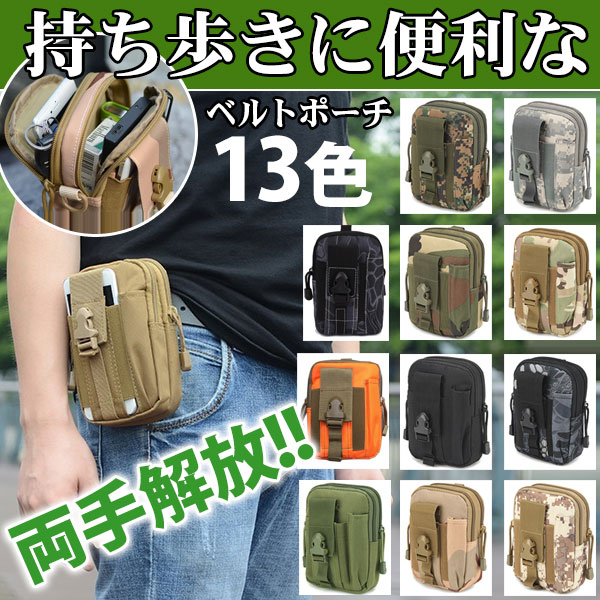 モバイルバッテリーを入れたり、お財布や貴重品、車のキーなどたくさん入ります♪お使いのベルトを通して腰の部分に装着し、丈夫な構造で簡単に外れることはありません。ポーチの素材に撥水性加工を施してあるので、雨や汗などのアクシデントから中身のスマホなどを完全ガードします☆迷彩柄など10つのデザインからお選びいただけます。旅行、サバイバルゲーム、フィッシング、ハイキング、登山などで活躍!