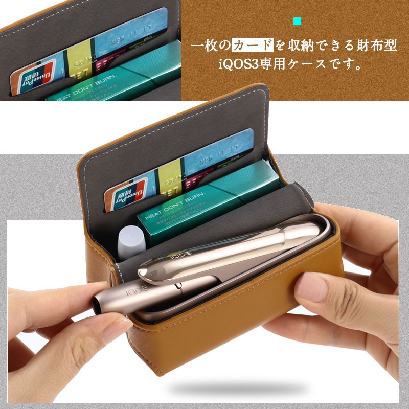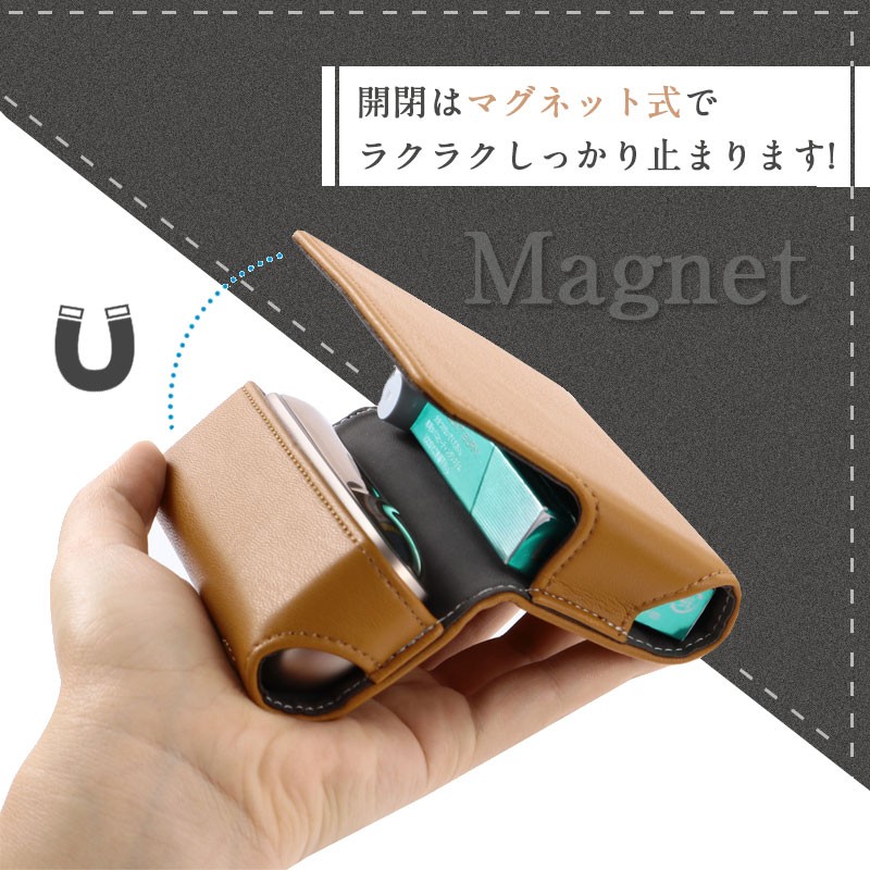 iQOS3本体、ヒートスティック、クリーナーがこれ1つに収納できるからとっても便利です!一枚のカードを収納できる財布型iQOS3専用ケースです。開閉はマグネット式でラクラクしっかり止まります。見た目もシンプルでスッキリします!ケースに入れたままヒートスティックの取り出しがスムーズにできます!専用設計なので、ケースに入れたままの充電も可能になります。コンパクト設計で持ち運びもしやすいです。