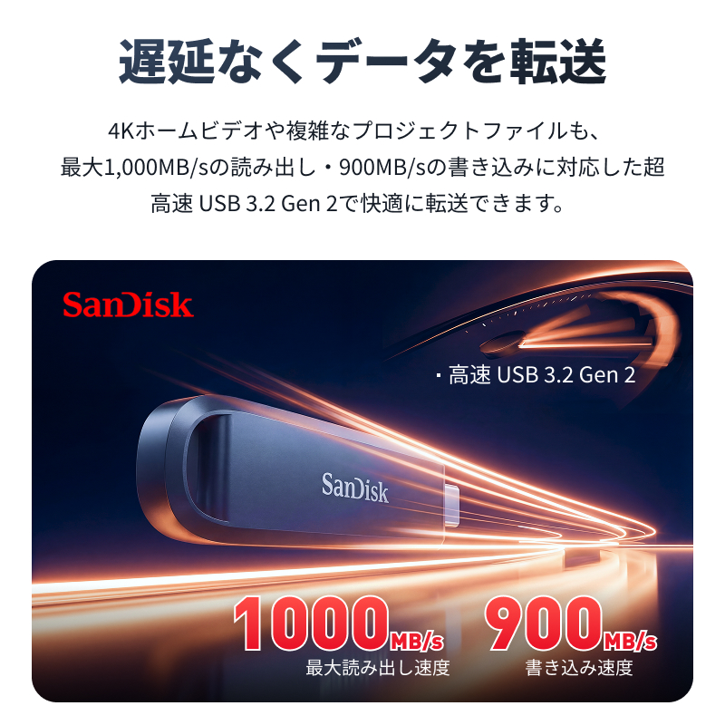 4Kのホームビデオでも複雑なプロジェクトファイルでも、最大1000MB/秒の読み出しと900MB/秒の書き込み速度という超高速パフォーマンスのUSB 3.2 Gen でデータを転送します。