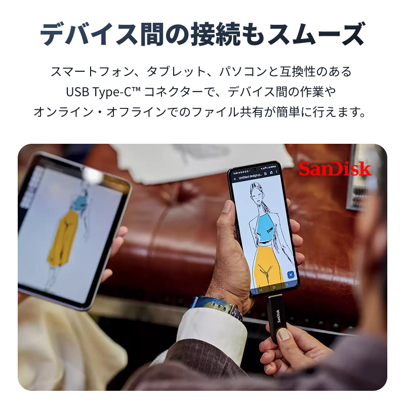 スマートフォン、タブレット、パソコンと互換性のある汎用性の高いUSB Type-C コネクターで、デバイス間でスムーズに作業して、オンラインやオフラインでファイルを共有できます。
