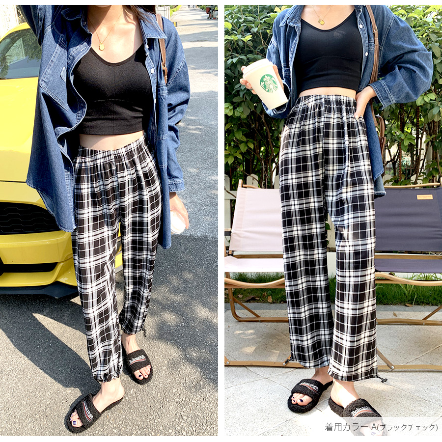 薄手で夏らしく涼しげなワイドパンツ。そのままワイドなシルエットでも、裾のドロストコードを絞ればジョガーパンツとしても2wayのアレンジができます♪印象の異なる柄を8パターンご用意しているので、気分やコーディネートに合わせて◎リラックスした履き心地なので、ゆったり着たいルームウェアにもおすすめです!