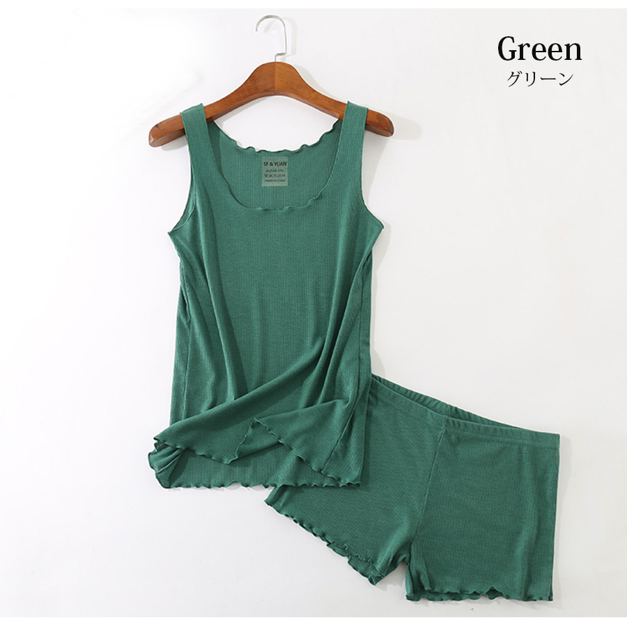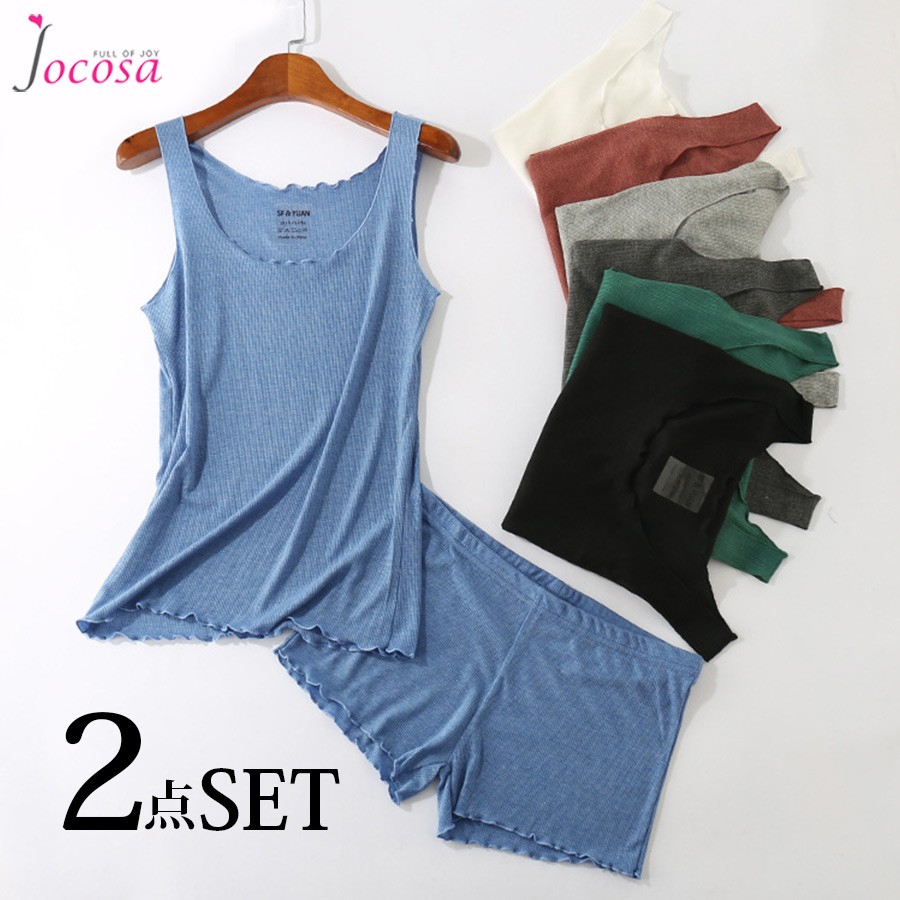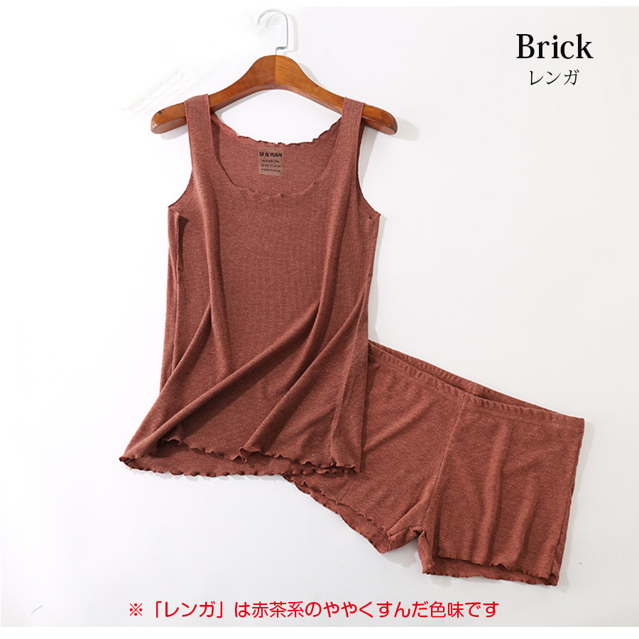 ルームウェア レディース キャミソール ショートパンツ フリル リブ パジャマ 黒 白 赤茶 ブラック グレー ホワイト ブルー グリーン レンガ JOCOSA 8417