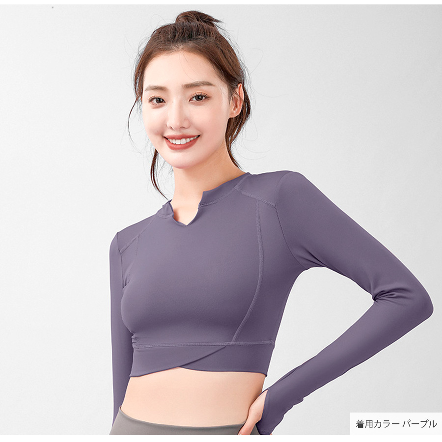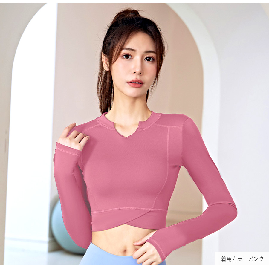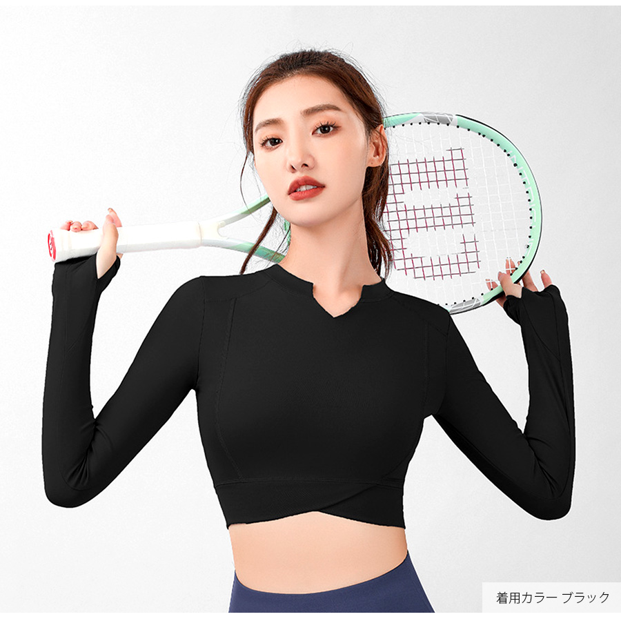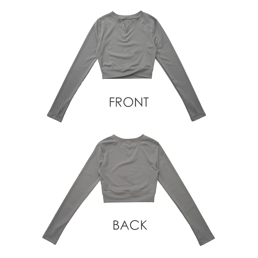 キーネックが今年らしいショート丈スポーツウェア。無地でシンプルながらさりげないステッチ等のデザイン性で使いやすさ◎指穴つきの長袖なので動いてもズレにくく安全・防寒対策も♪なめらかな触り心地の生地を使用しているので、動きやすく着心地も抜群です。
