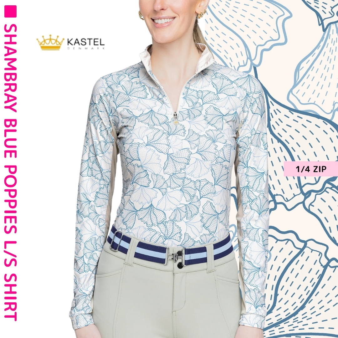 シャンブレーとスカイブルーのポピー柄が印象的な長袖トップス。UPF30の紫外線カット、通気性の良いメッシュ、動きやすいストレッチ素材で、軽量かつ快適な着心地です。