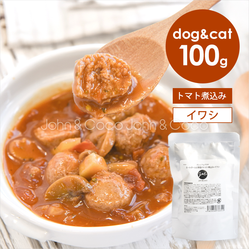 『 野菜のトマト煮込み 』は、食べ応えのある少し大き目のミートボールと、6種の野菜をトマトスープで煮込んだ、犬猫用ウェットフード。