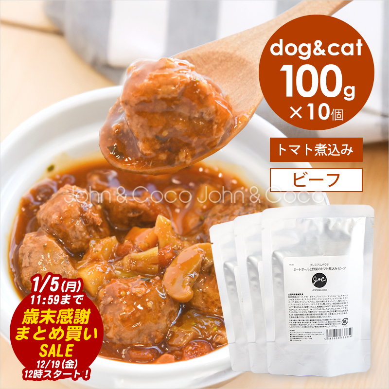 『 野菜のトマト煮込み 』は、食べ応えのある少し大き目のミートボールと、6種の野菜をトマトスープで煮込んだ、犬猫用ウェットフード。