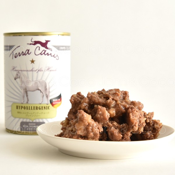 「テラカニス ハイポアレルジェニック 馬」は、ドイツバイエルンのお肉屋さんが厳選した、貴重な馬肉の精肉のみ(内臓は不使用)を60%使用し、 1種類のお肉と1種類の野菜、亜麻仁油を組み合わせています。