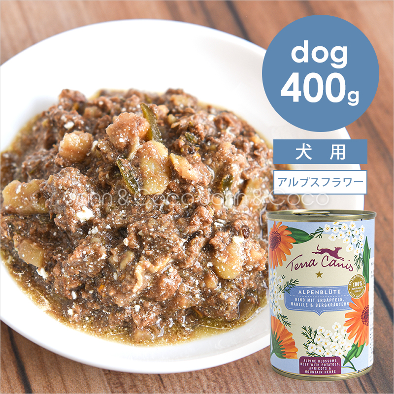 テラカニス フラワーメニュー アルプスフラワー 400g 犬 ドッグフード ウェットフード 牛肉 アプリコット ラズベリー 野菜 フルーツ ハーブ ヒューマングレード
