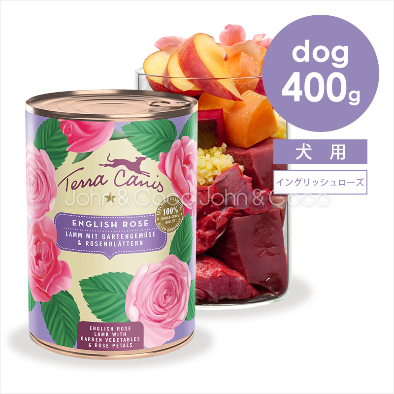 「イングリッシュローズ」はイングリッシュガーデンでの犬とのくつろぎ時間をイメージして作られ、ラム肉をベースに野菜やフルーツ、ハーブを加えています。