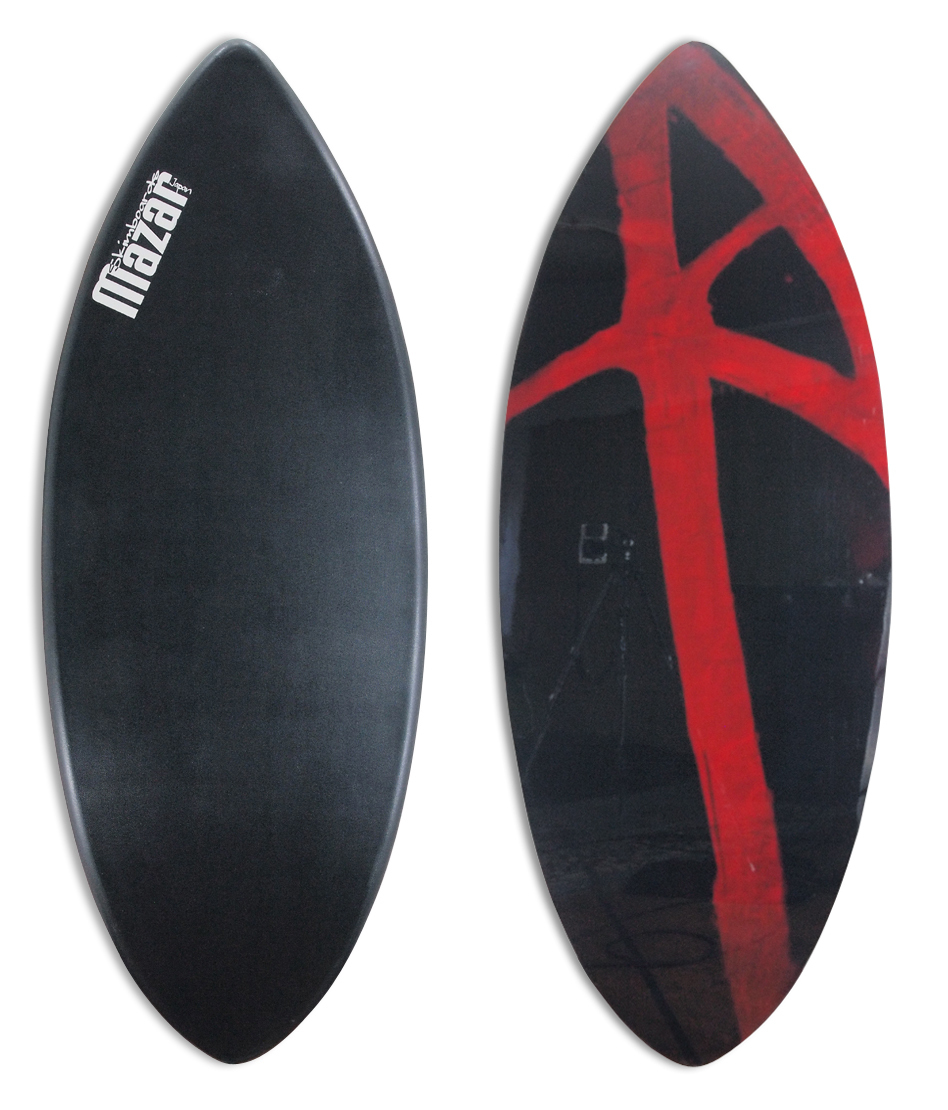 設計の力点はオンボードの確実性と水面での安定感。そしてはじかれにくいターンのコントロール性能。デッキ、ボトム共にそれぞれ16オンスのE-glassを積層し高い耐久性と衝撃強度を持たせた。適切なフレックス・浮力・弾性を兼ね備え、ライダーの技能に応じたレスポンスを発揮するオールラウンドなスキムボード。