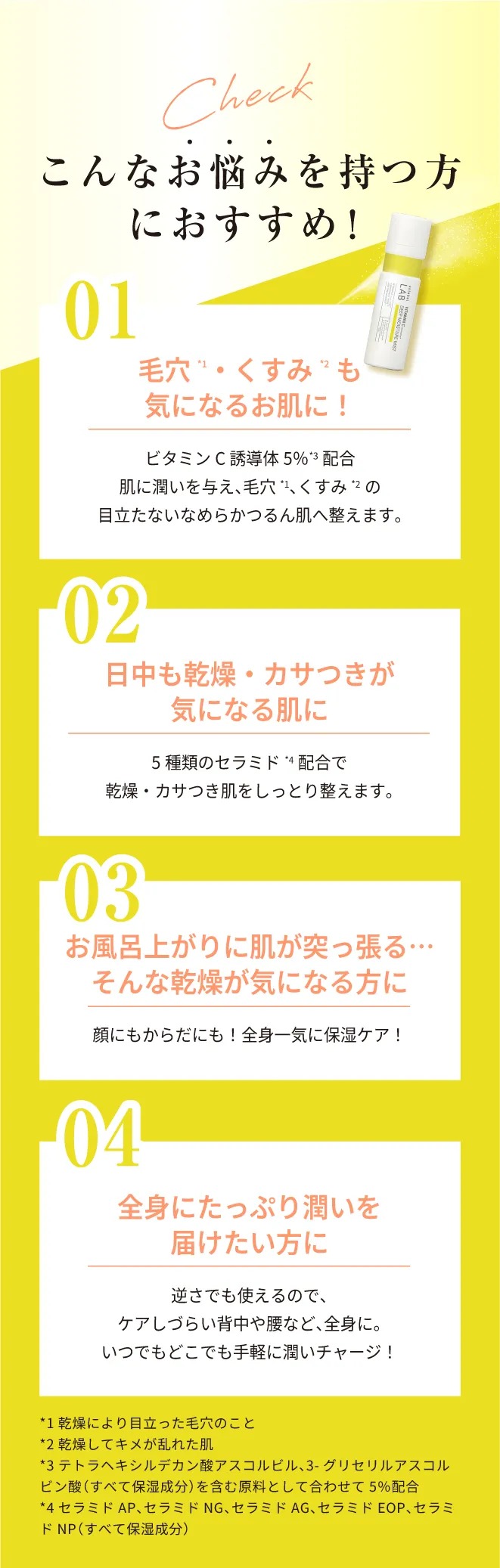 | 成分 | 【全成分】水、グリセリン、温泉水、BG、PEG/PPG/ポリブチレングリコール-8/5/3グリセリン、3-グリセリルアスコルビン酸、テトラヘキシルデカン酸アスコルビル、セラミドAP、セラミドNG、セラミドAG、セラミドEOP、セラミドNP、グルタチオン、リノール酸レチノール、ナイアシンアミド、ニコチンアミドモノヌクレオチド、アセチルヘキサペプチド-8、グリシルグリシン、アーチチョーク葉エキス、加水分解コラーゲン、加水分解ヒアルロン酸、加水分解エラスチン、ツボクサ葉/茎エキス、グリチルリチン酸2K、アラントイン、ベタイン、シクロヘキサン-1,4-ジカルボン酸ビスエトキシジグリコール、PCA-Na、PG、水添レシチン、クオタニウム-18、クオタニウム-33、コレステロール、フィトステロールズ、トリエチルヘキサノイン、イソステアリルアルコール、PPG-13デシルテトラデセス-24、クエン酸Na、クエン酸、窒素、フェノキシエタノール |