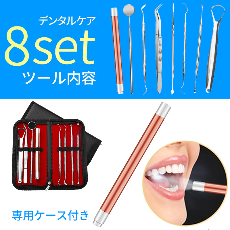 8本デンタルケアセット ライト付き 歯石取り器具 ステンレス製 歯石取り器具人用 歯間 ヤニ 歯垢取り 口臭予防 プロ用 抗菌 #br34