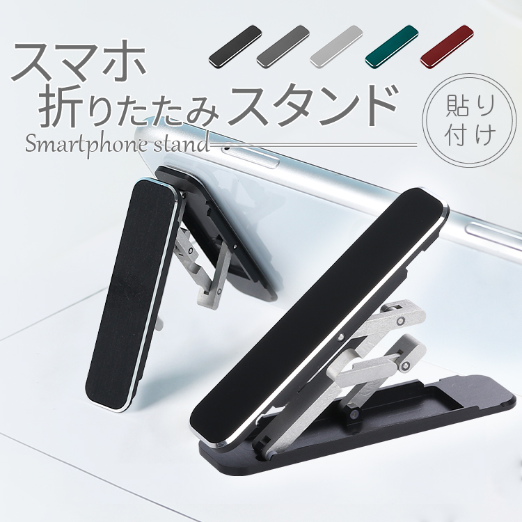 スマホスタンド アルミ製 5色 スマホ全機種対応 スマホ折りたたみスタンド 携帯スタンド 貼り付け コンパクト 小型 シンプル おしゃれ 角度調整 頑丈