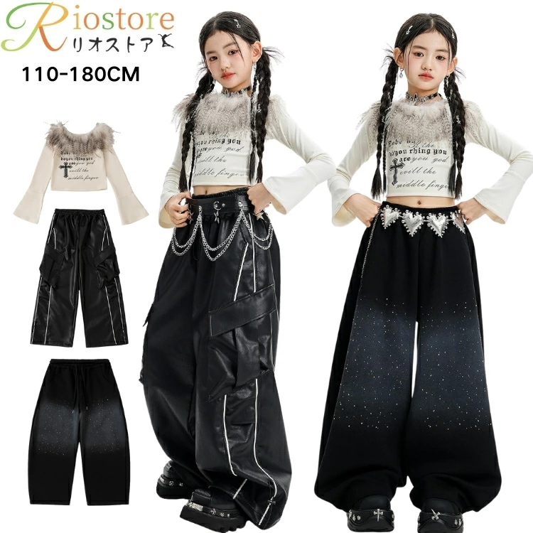 キッズ ダンス衣装 ショー 黒 ロンパン k-pop 衣装 レザーダンスウェア ズボン 長袖 ダンス衣装 へそ出し キッズダンス 演出服 女の子 ダンス 衣装 レザー かっ