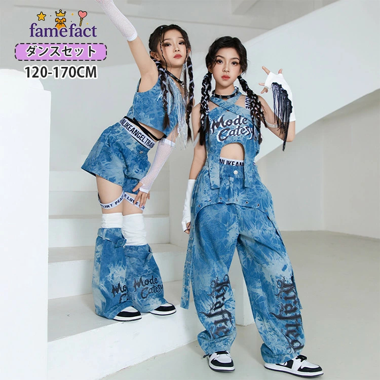 タイダイ ブルー デニム 女の子 ダンスウェア ダンス衣装 青 ワンショルダートップス 斜め肩 フリンジ付き ホルターネック 無袖 短パン レッグカバー ズボン パ