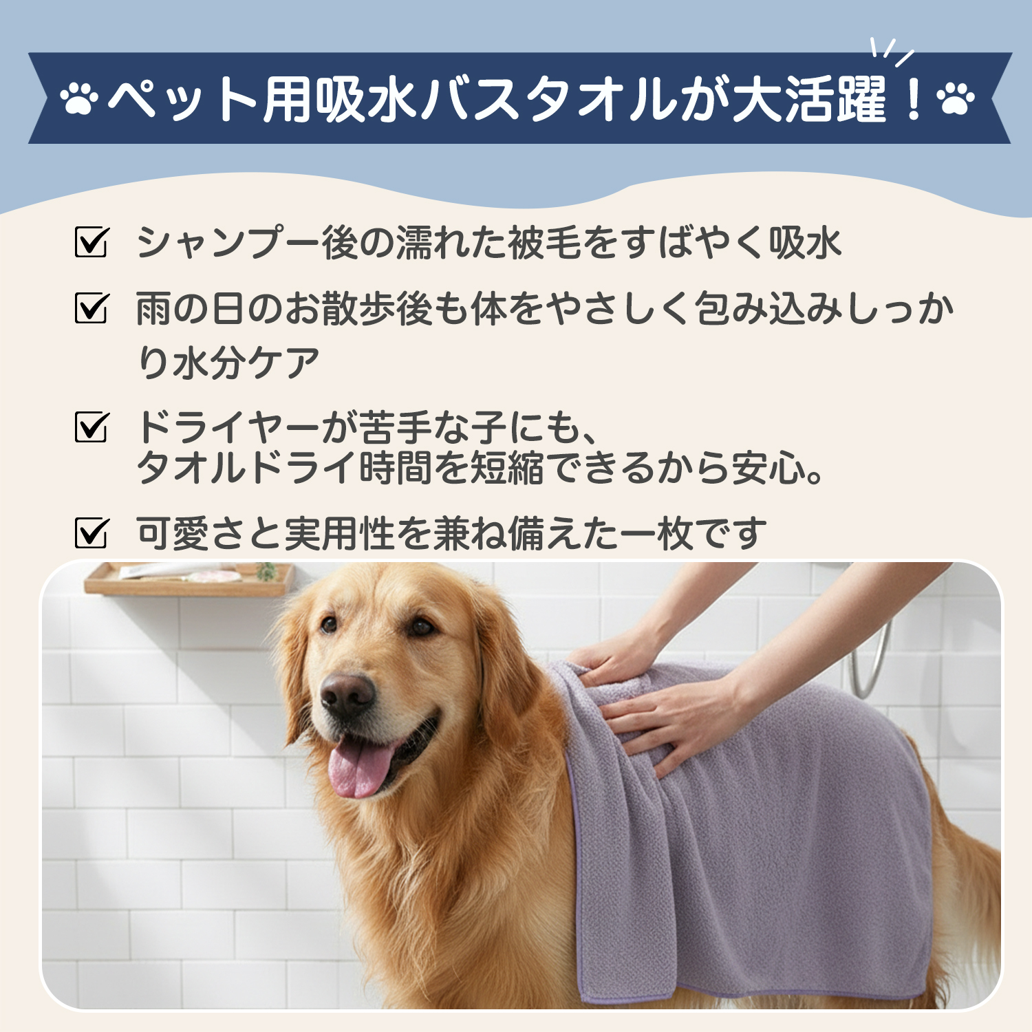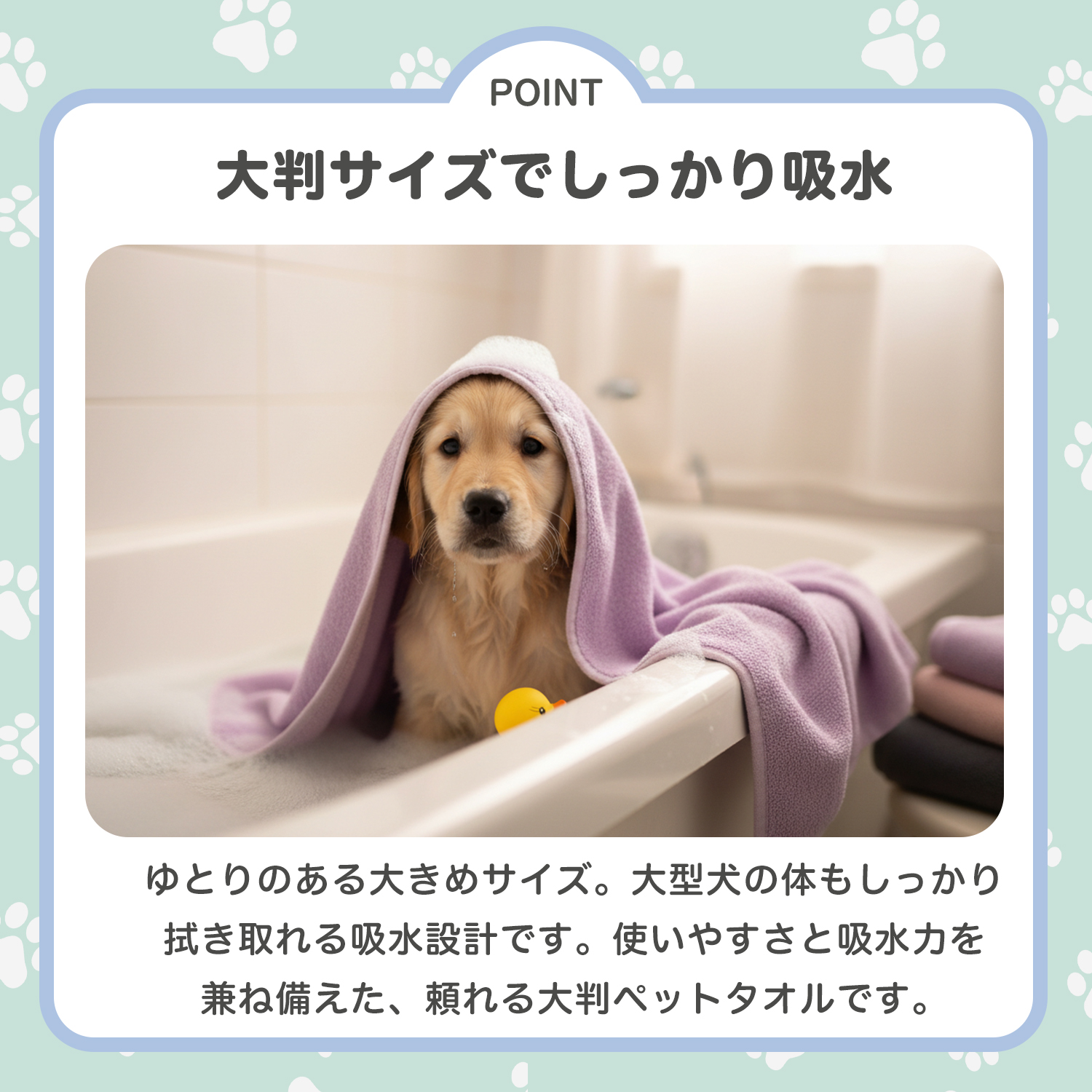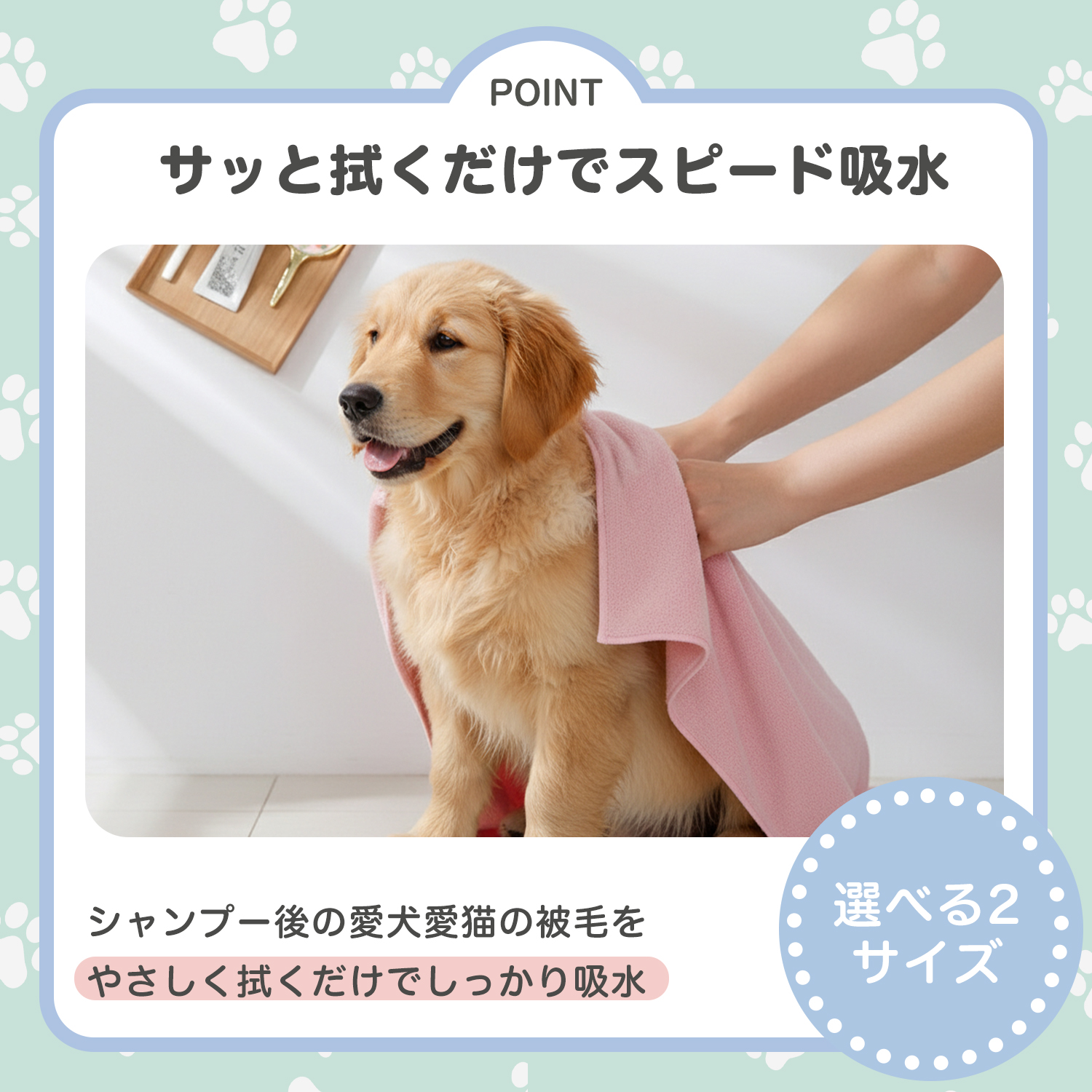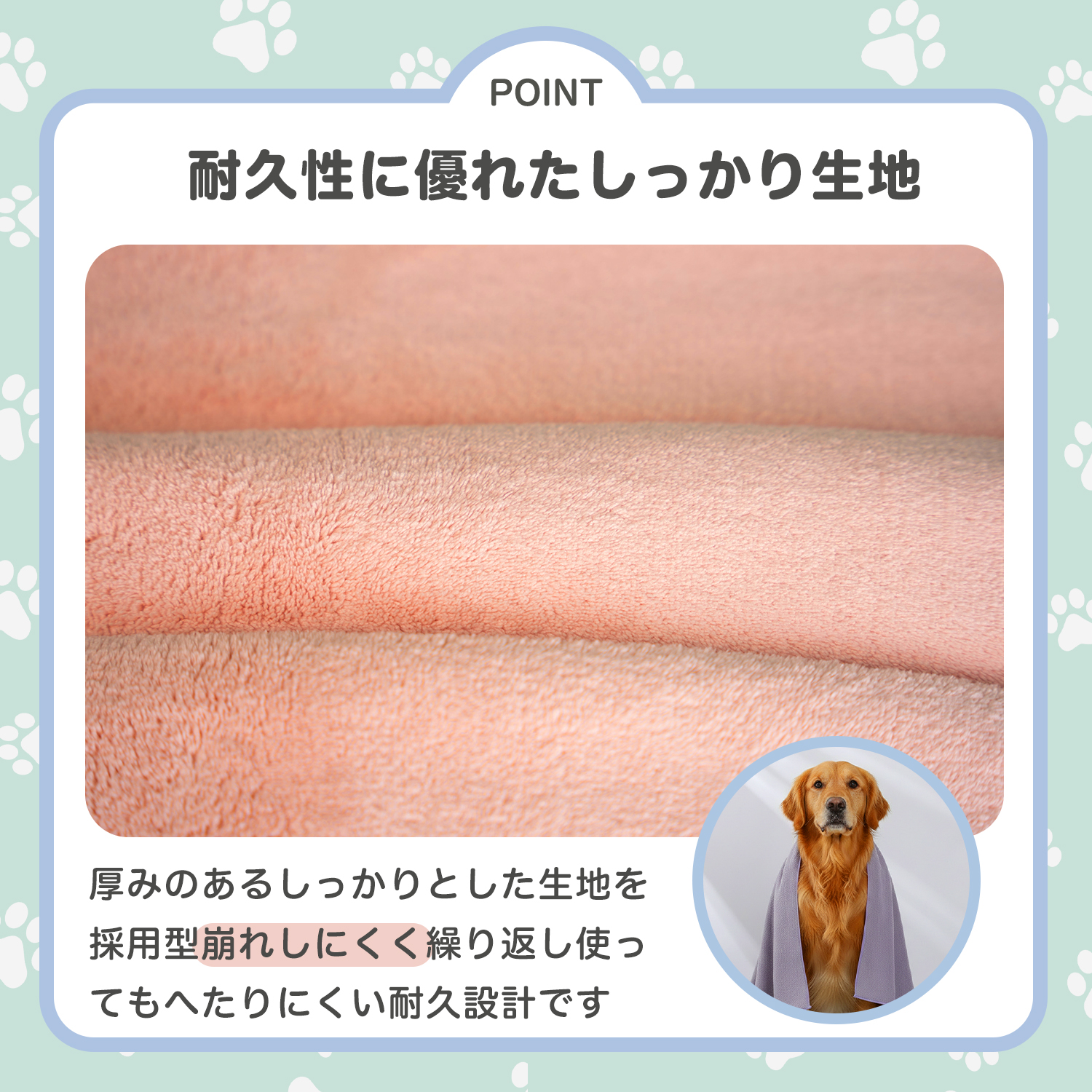 商品説明 シャンプー後や散歩後の水分拭き取りに使える大判タオル。やわらかいマイクロファイバーで全身を拭きやすく、折りたたみ収納可。ループ付きで掛けて乾かせます。