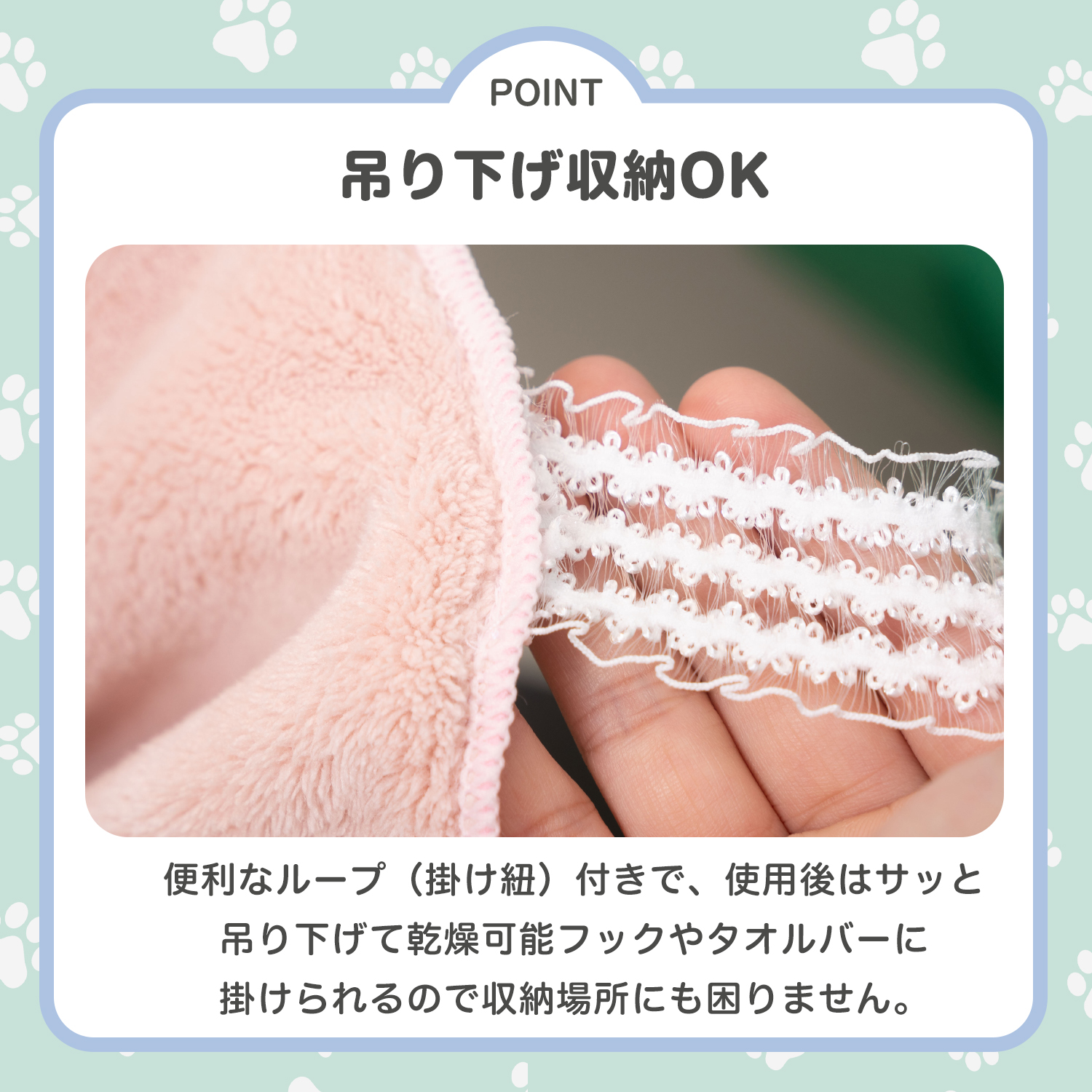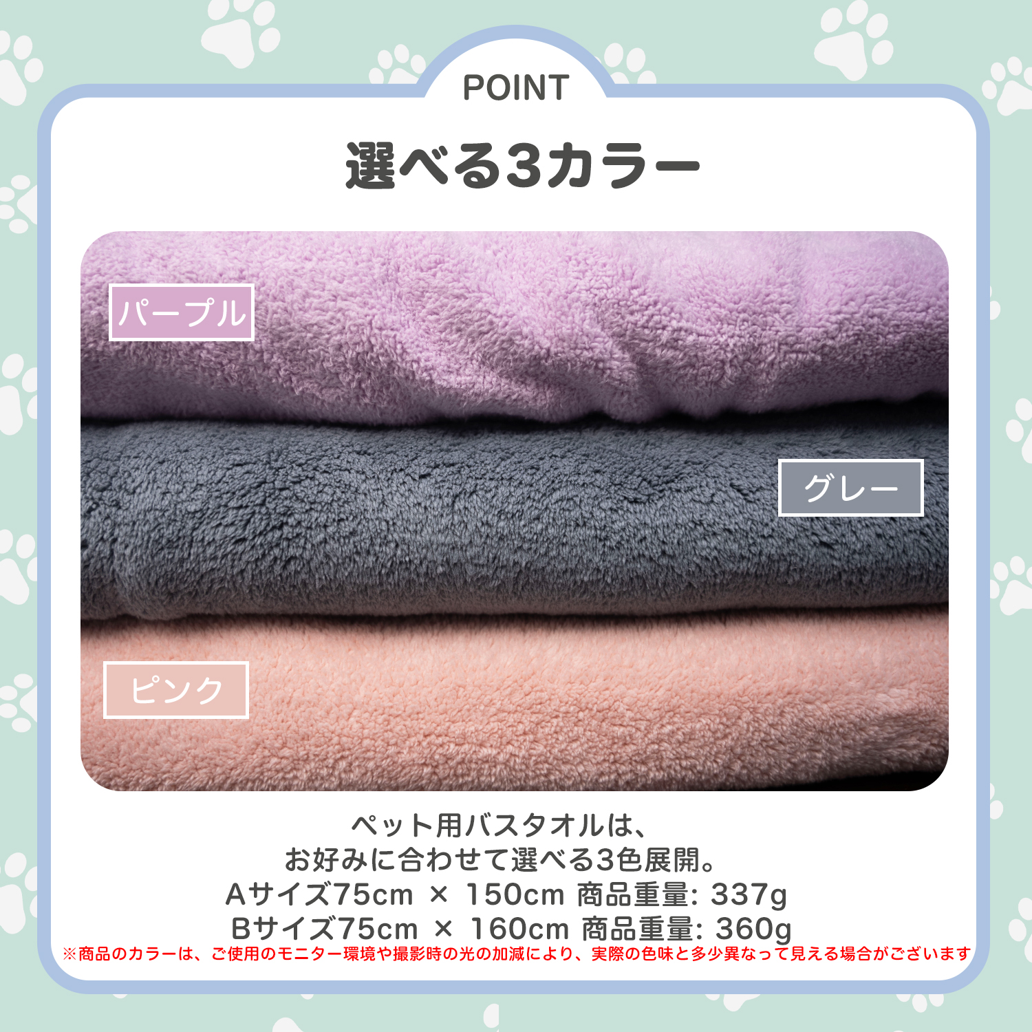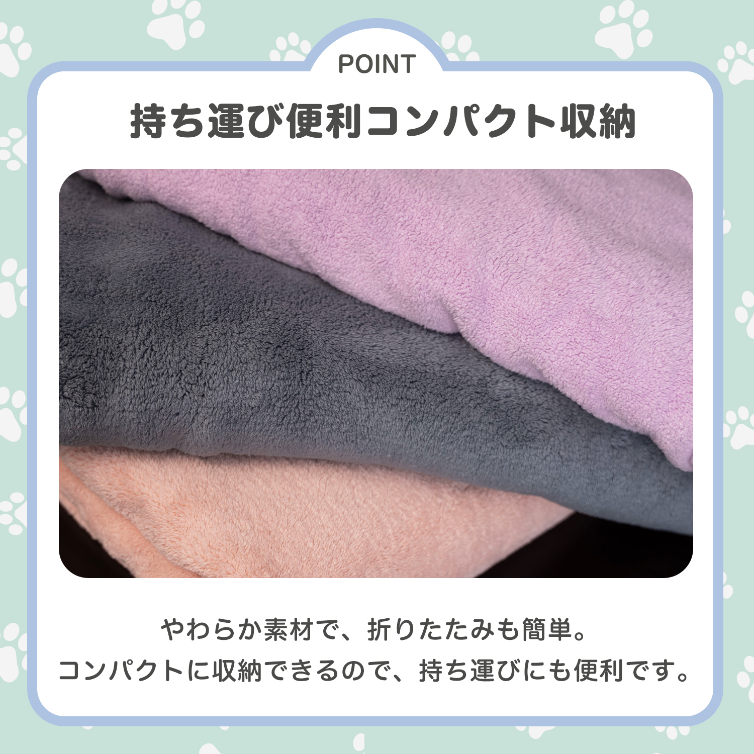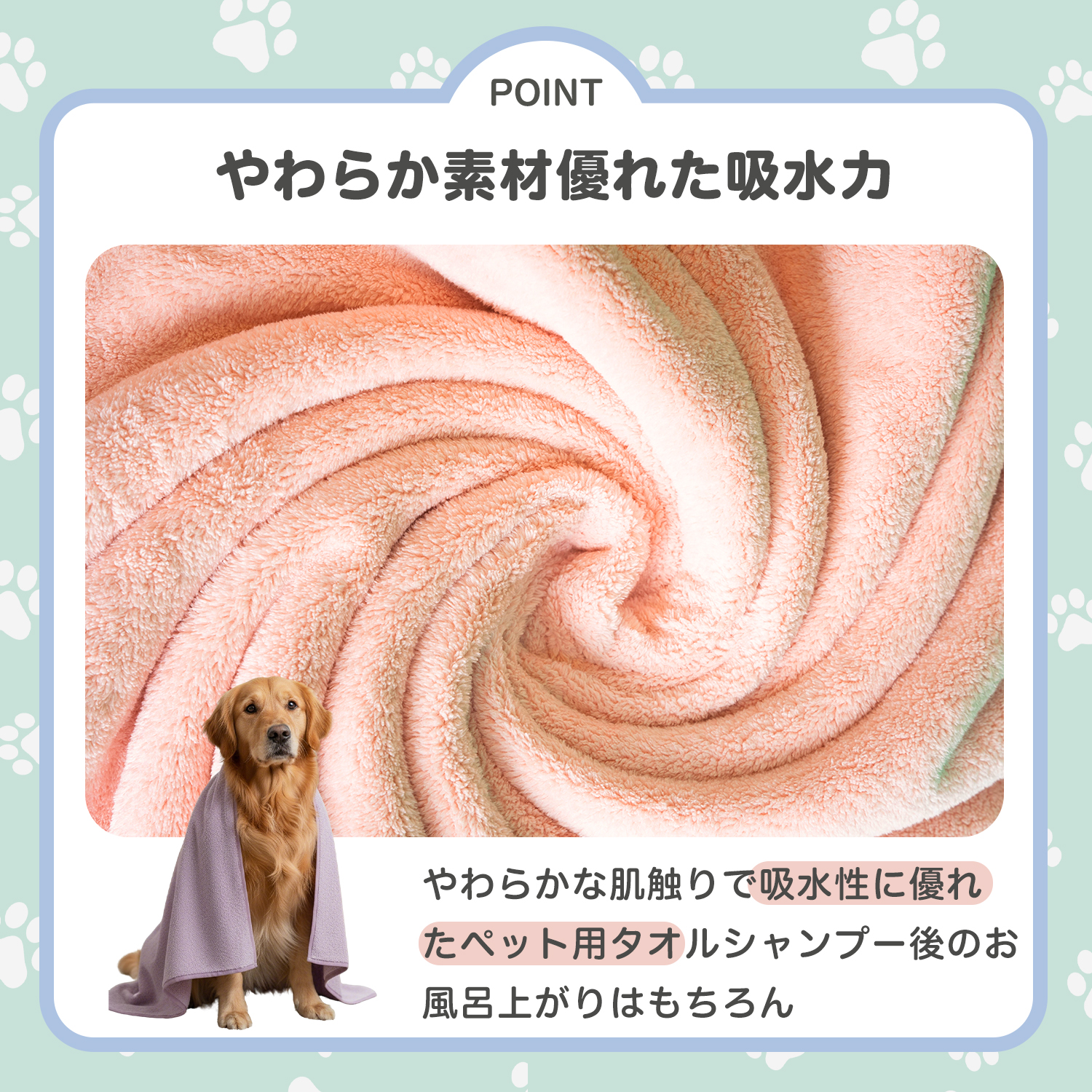 商品説明 シャンプー後や散歩後の水分拭き取りに使える大判タオル。やわらかいマイクロファイバーで全身を拭きやすく、折りたたみ収納可。ループ付きで掛けて乾かせます。