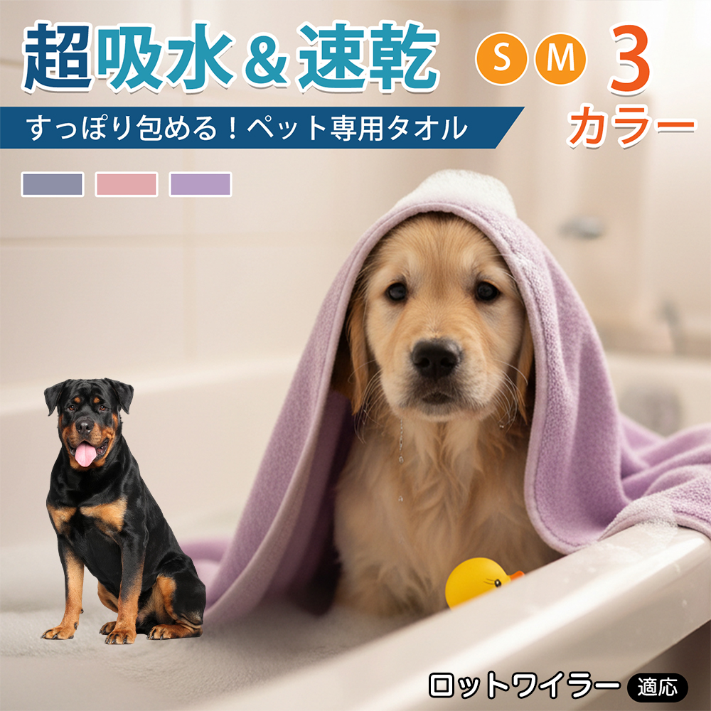 商品説明 シャンプー後や散歩後の水分拭き取りに使える大判タオル。やわらかいマイクロファイバーで全身を拭きやすく、折りたたみ収納可。ループ付きで掛けて乾かせます。