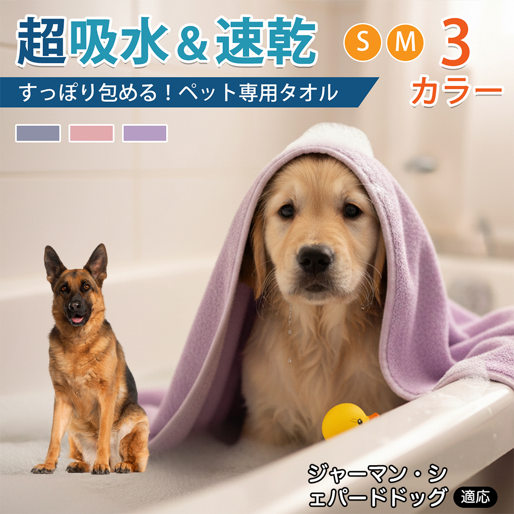 商品説明 シャンプー後や散歩後の水分拭き取りに使える大判タオル。やわらかいマイクロファイバーで全身を拭きやすく、折りたたみ収納可。ループ付きで掛けて乾かせます。