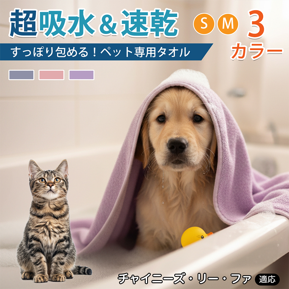 商品説明 シャンプー後や散歩後の水分拭き取りに使える大判タオル。やわらかいマイクロファイバーで全身を拭きやすく、折りたたみ収納可。ループ付きで掛けて乾かせます。