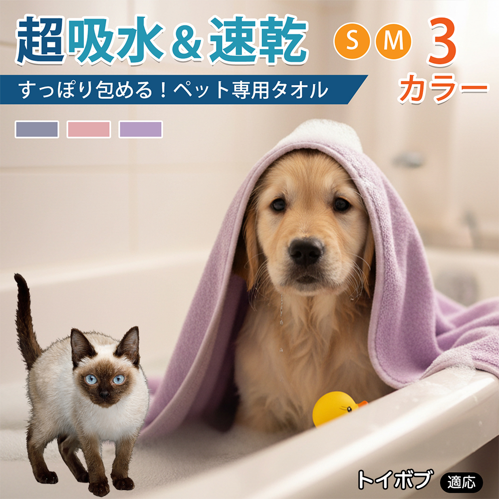 商品説明 シャンプー後や散歩後の水分拭き取りに使える大判タオル。やわらかいマイクロファイバーで全身を拭きやすく、折りたたみ収納可。ループ付きで掛けて乾かせます。