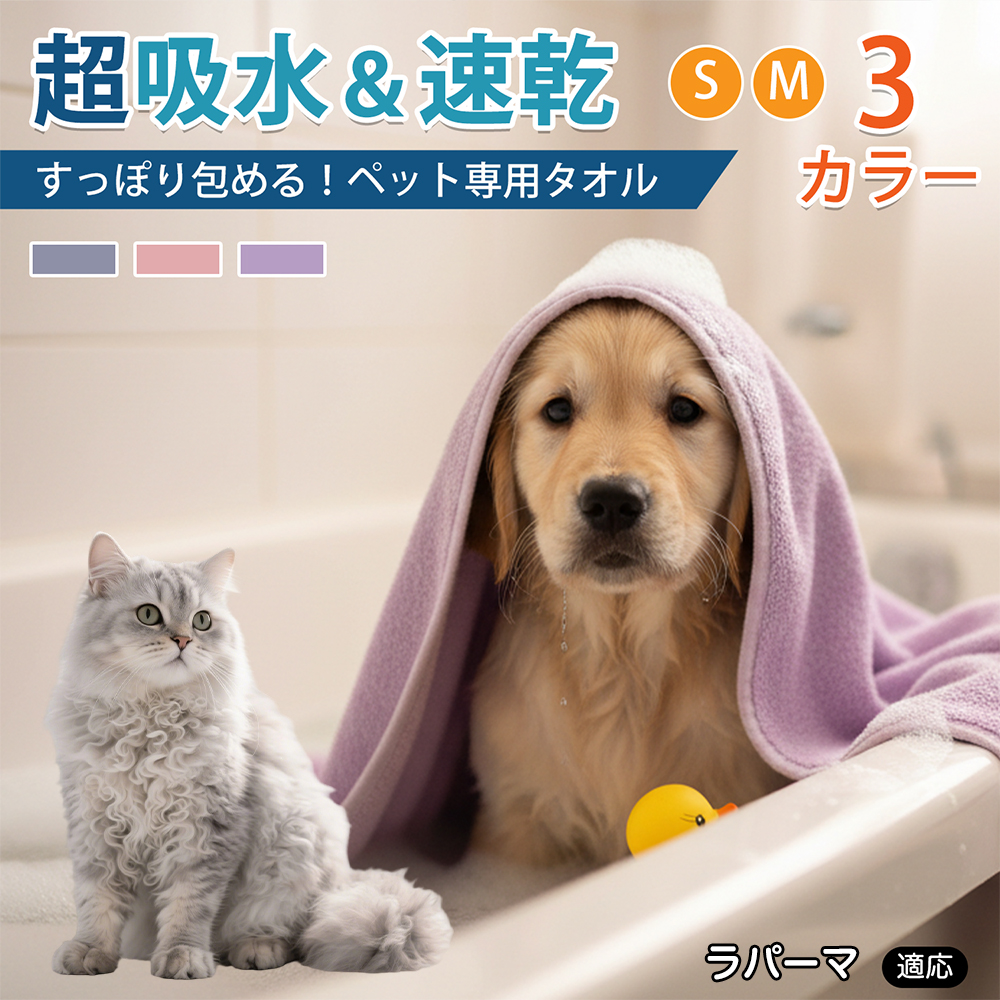 商品説明 シャンプー後や散歩後の水分拭き取りに使える大判タオル。やわらかいマイクロファイバーで全身を拭きやすく、折りたたみ収納可。ループ付きで掛けて乾かせます。