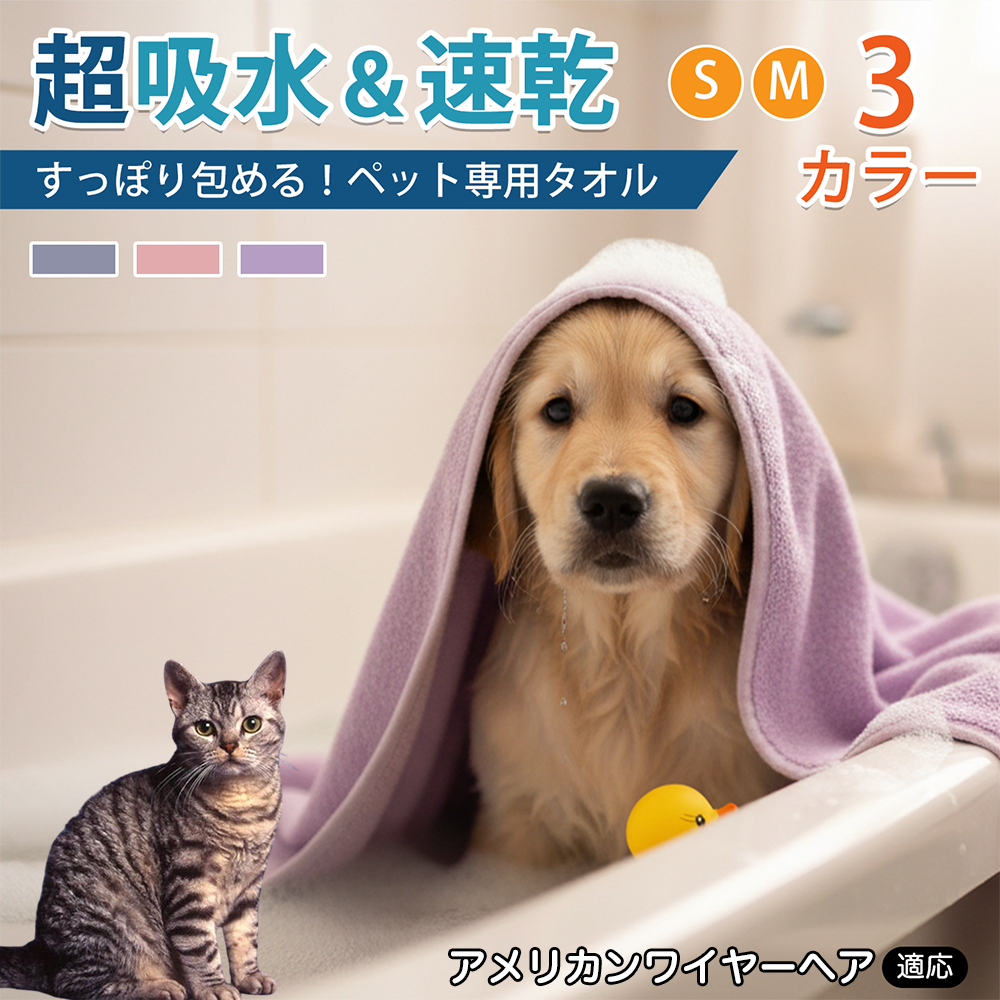 商品説明 シャンプー後や散歩後の水分拭き取りに使える大判タオル。やわらかいマイクロファイバーで全身を拭きやすく、折りたたみ収納可。ループ付きで掛けて乾かせます。