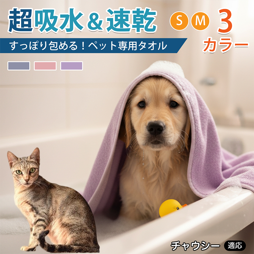 商品説明 シャンプー後や散歩後の水分拭き取りに使える大判タオル。やわらかいマイクロファイバーで全身を拭きやすく、折りたたみ収納可。ループ付きで掛けて乾かせます。
