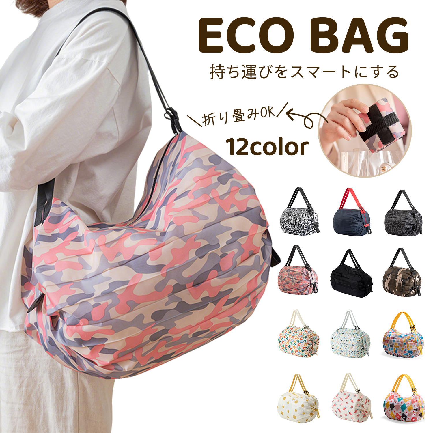 エコバッグ ファスナー 折りたたみ ファスナー付き 軽量 防水 コンパクト マチ広 ナイロン 肩掛け 買い物袋 おしゃれ かわいい