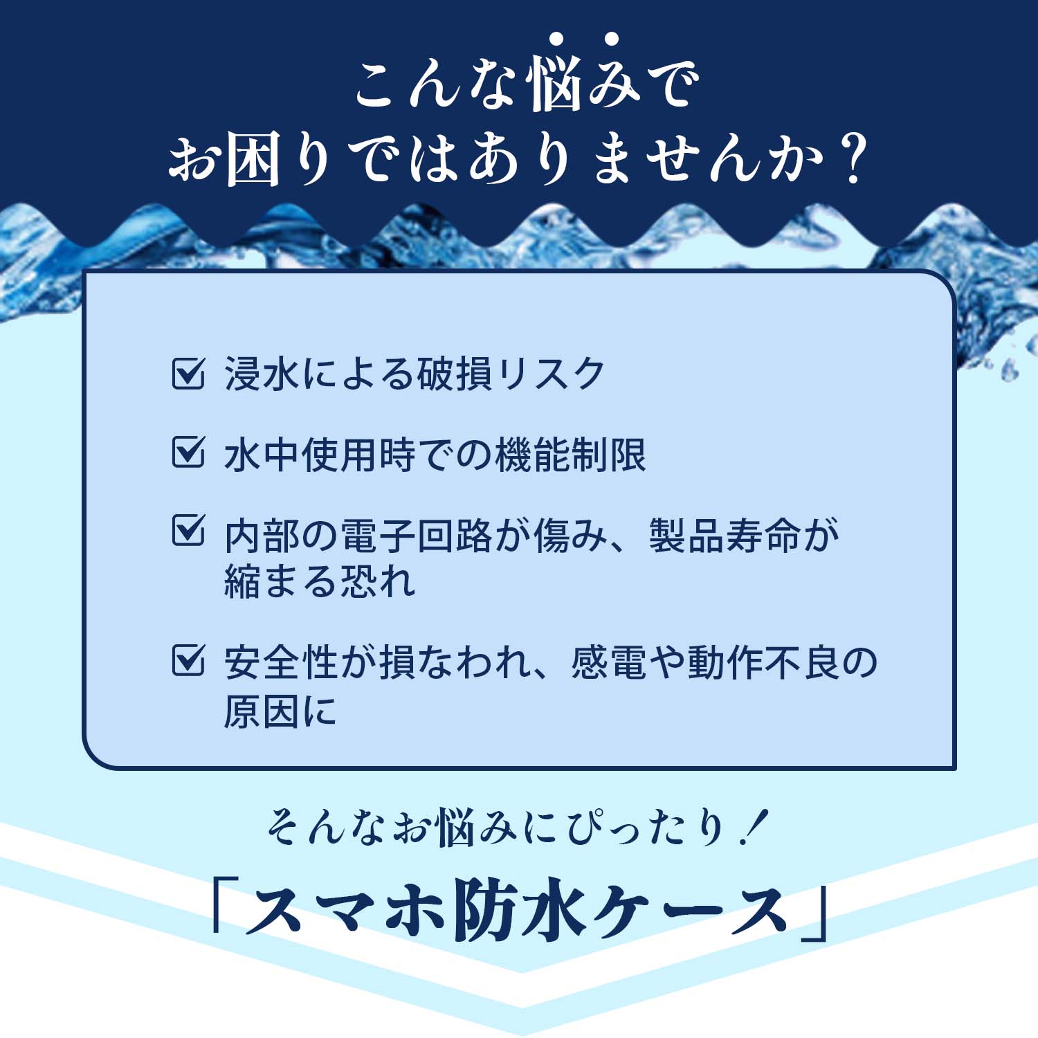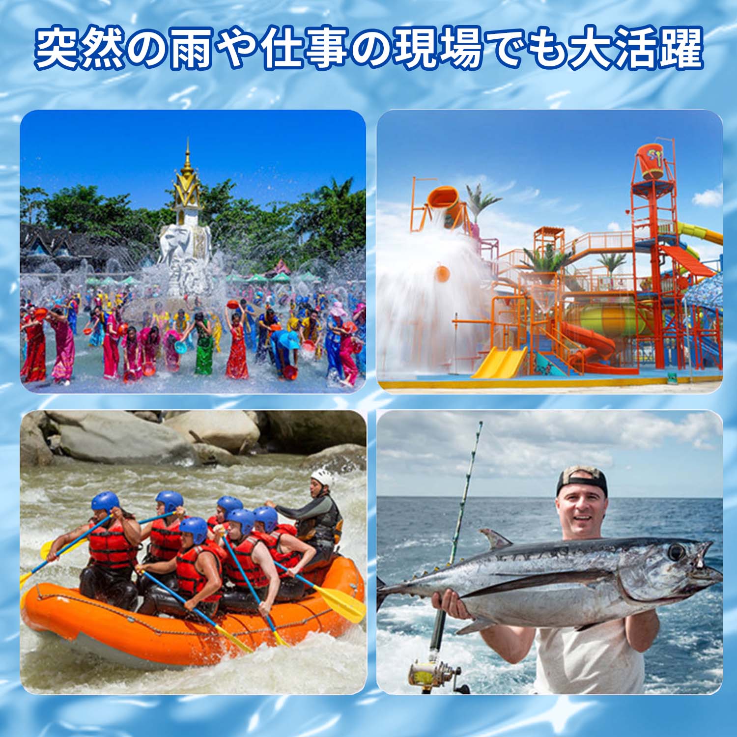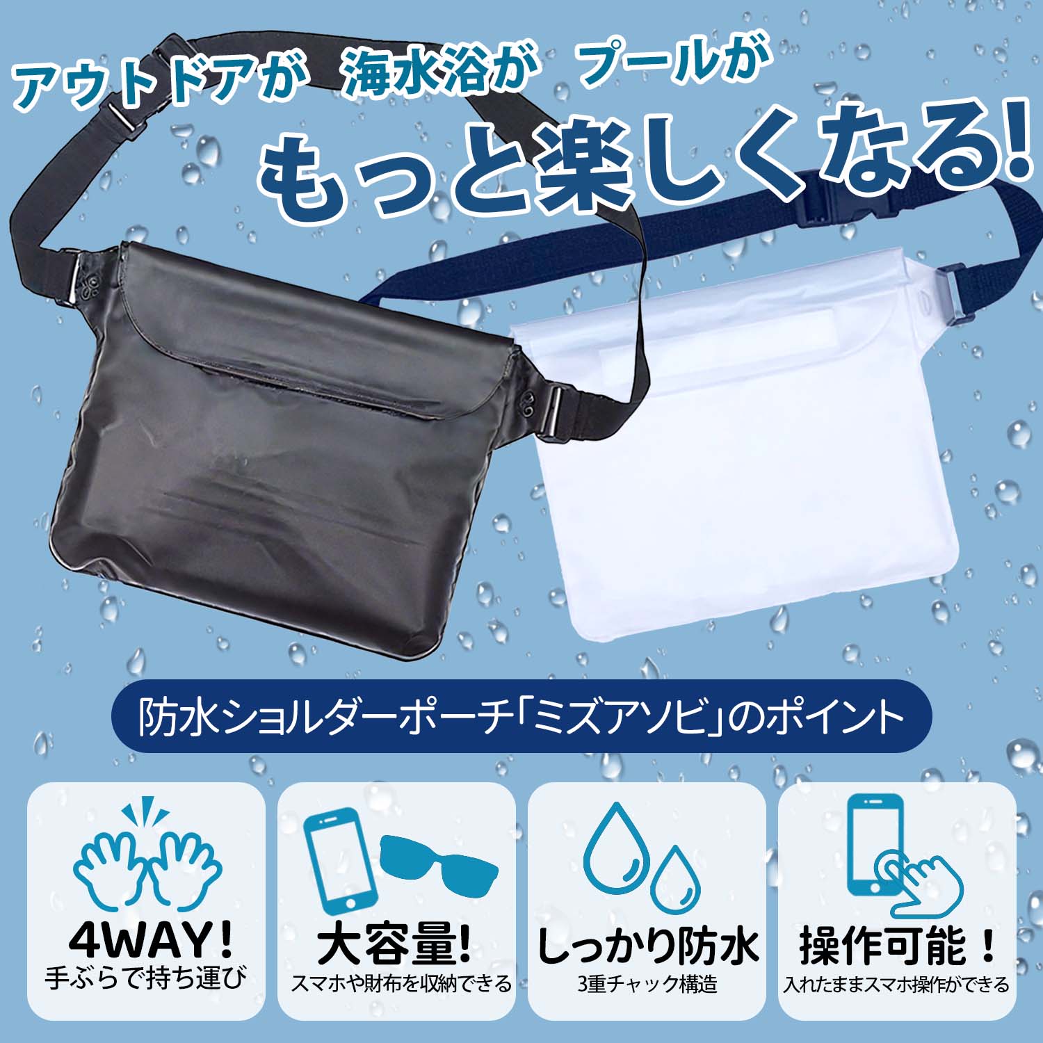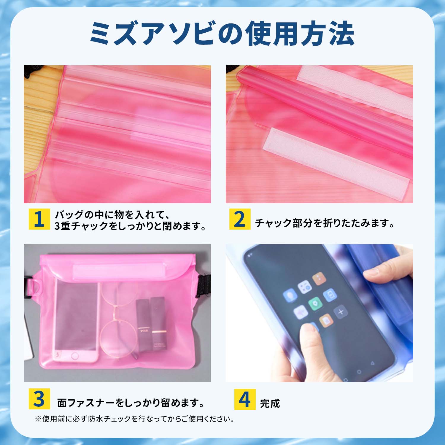 「ミズアソビ」は水回りのレジャーや突然の雨、アウトドアに最適な多機能防水ポーチ。3重チャックとフラップで密封し、IPX8等級の防水性能を実現。スマホを入れても画面タッチ操作が可能(指紋認証不可)。ベルトは80〜110cm調節可能でショルダー、ウエスト、ハンド、ボディの4通りに使える。浮力があるためプールや海でも安心。2個セットで家族や友人とシェア可能。