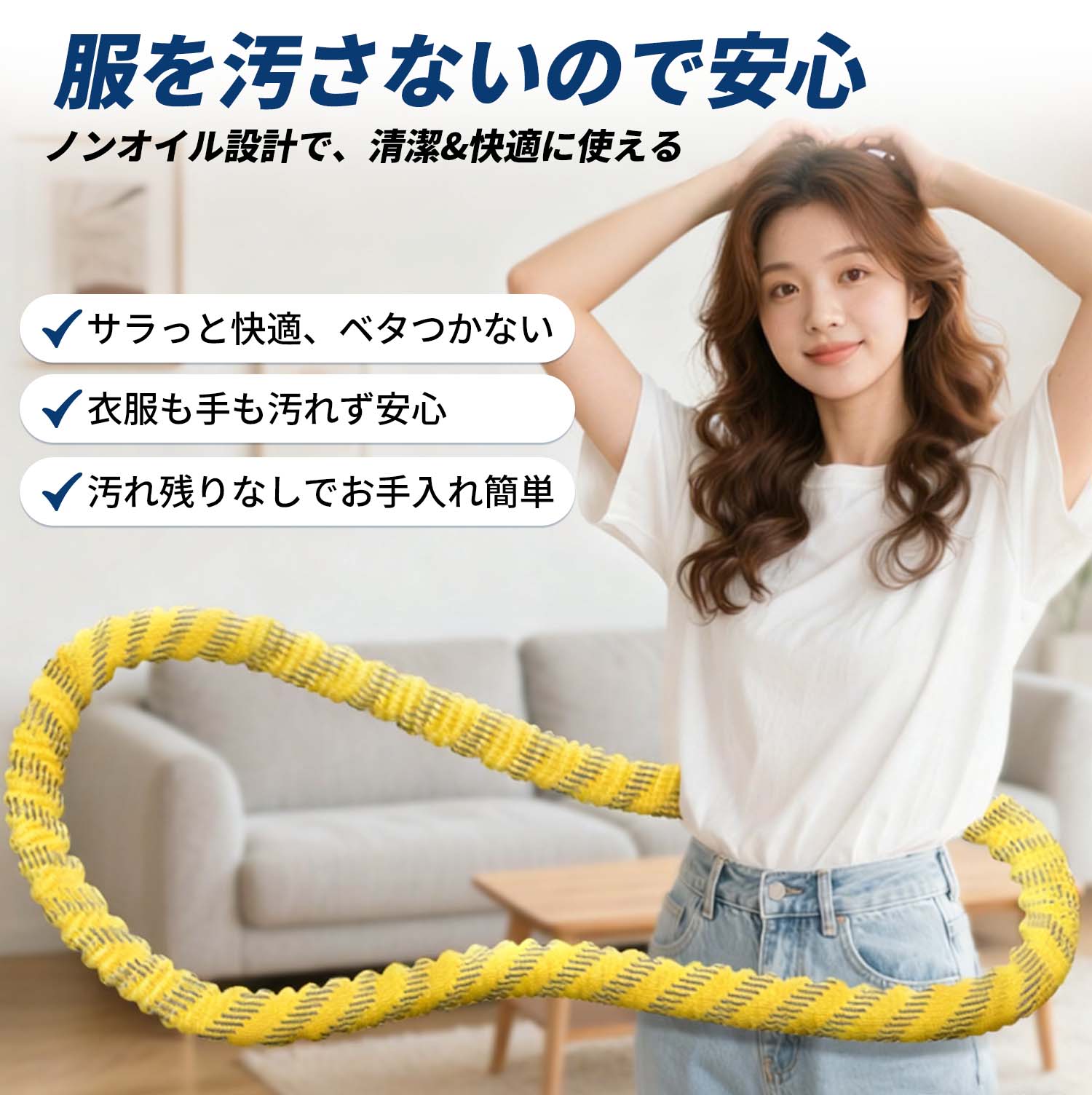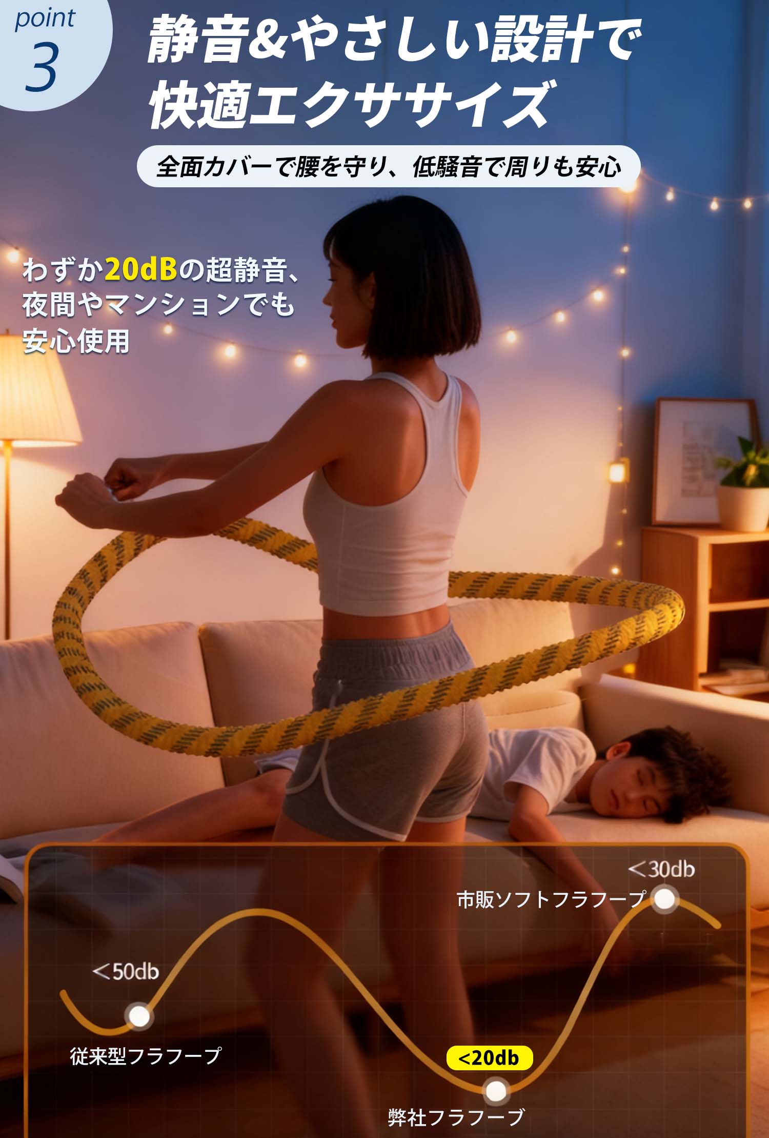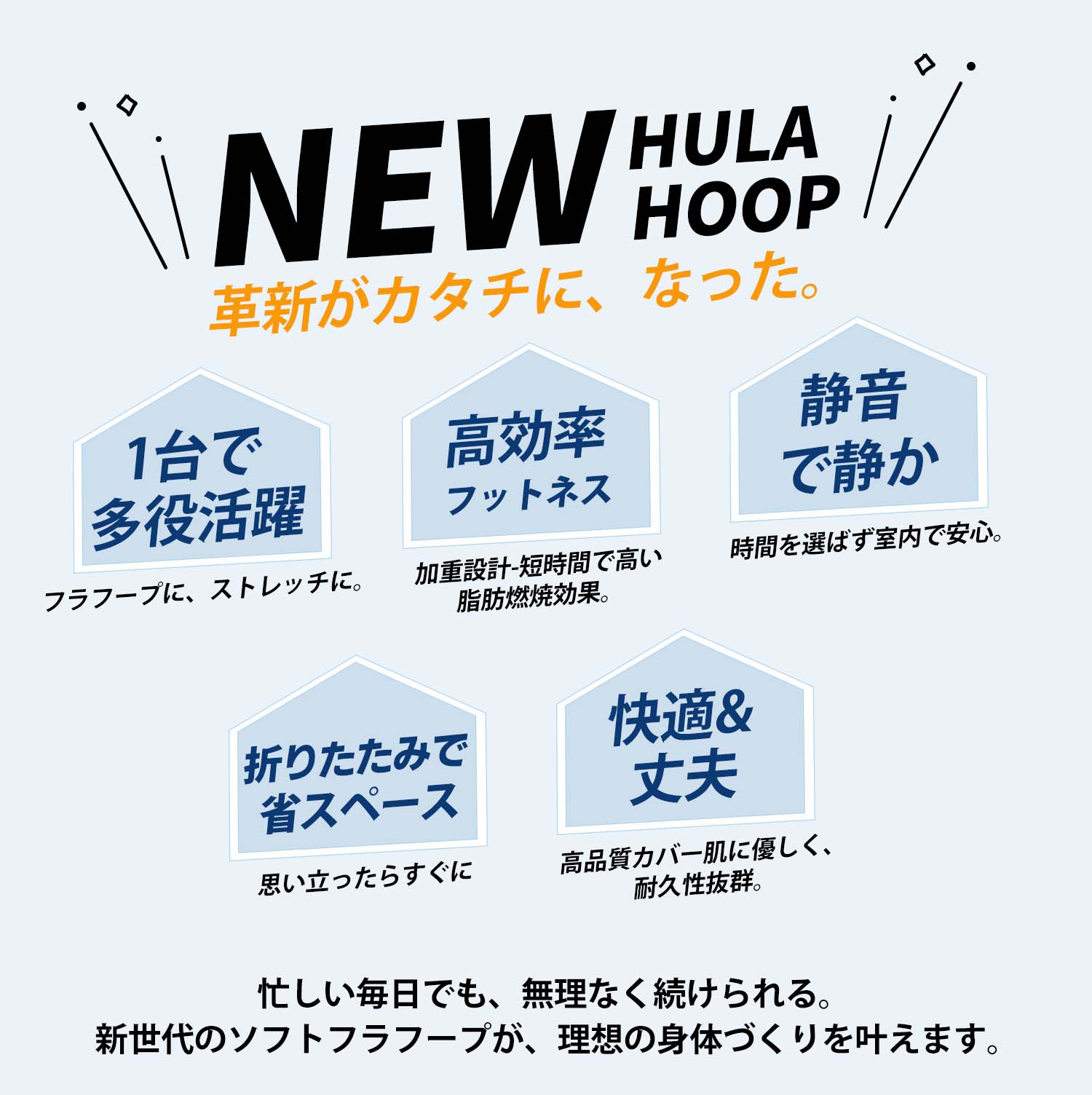 キーワード:フラフープ、くびれ、脂肪燃焼、自宅エクササイズ、静音、収納便利、家族共用、スムーズ回転、Soft素材、10分運動