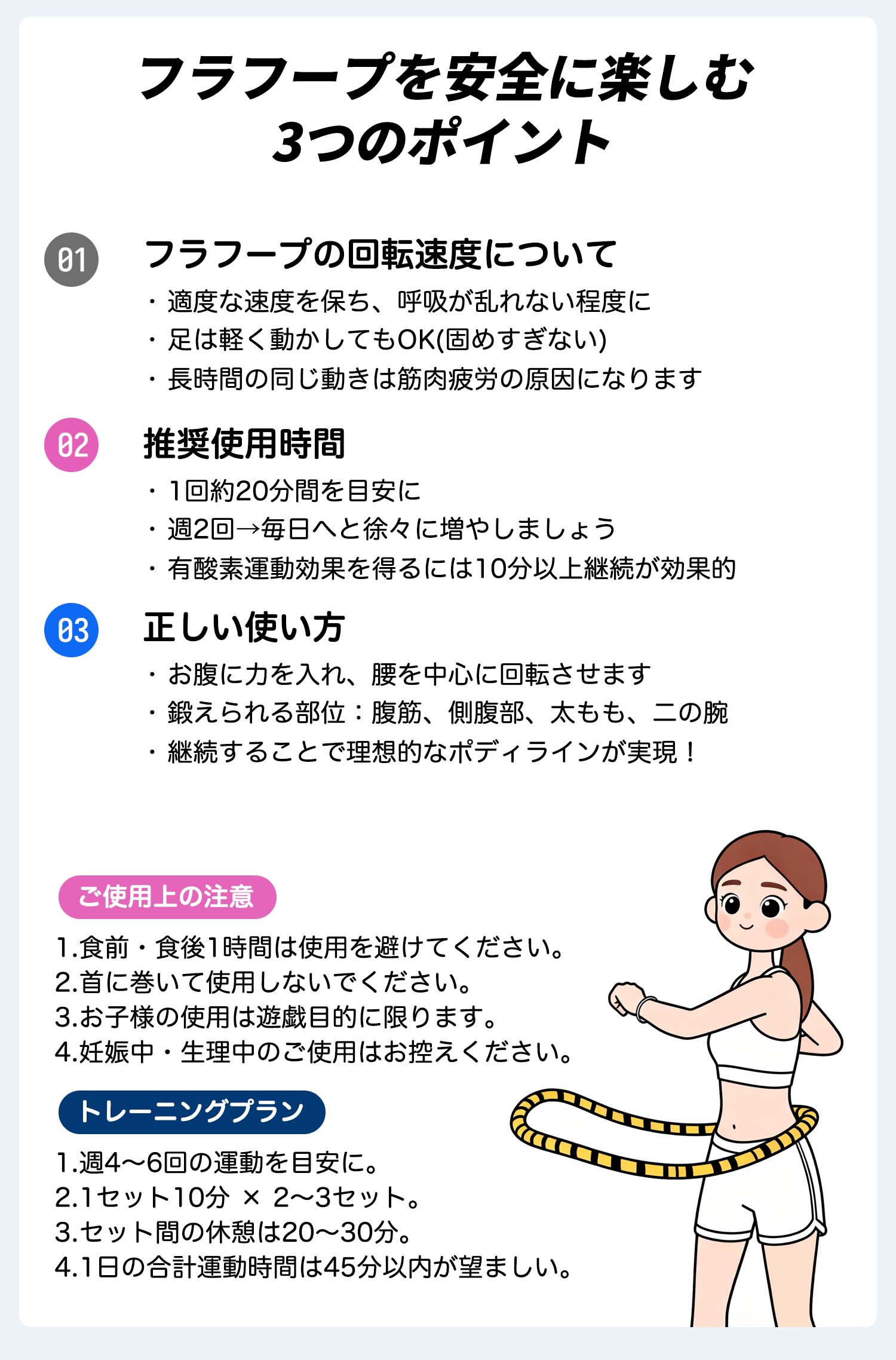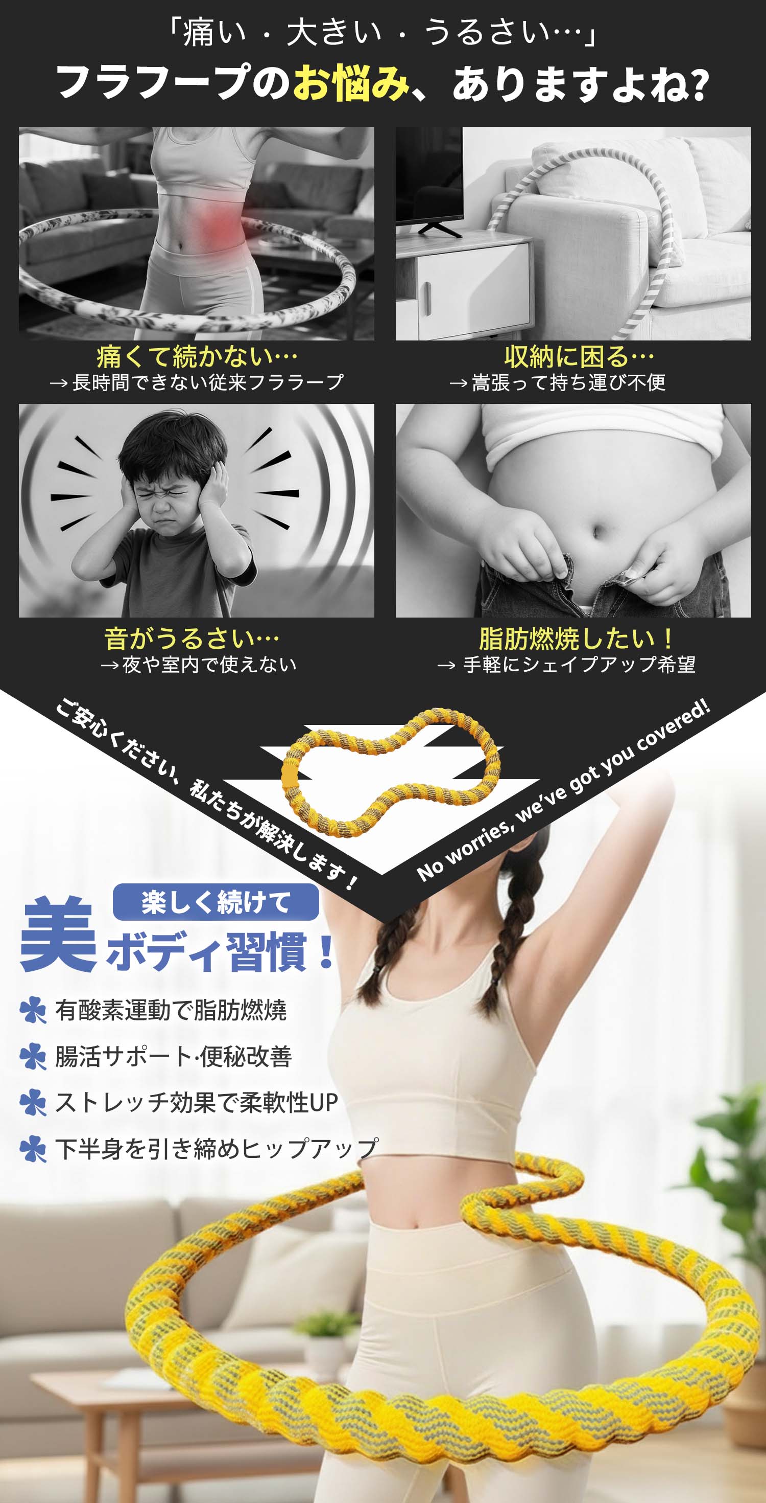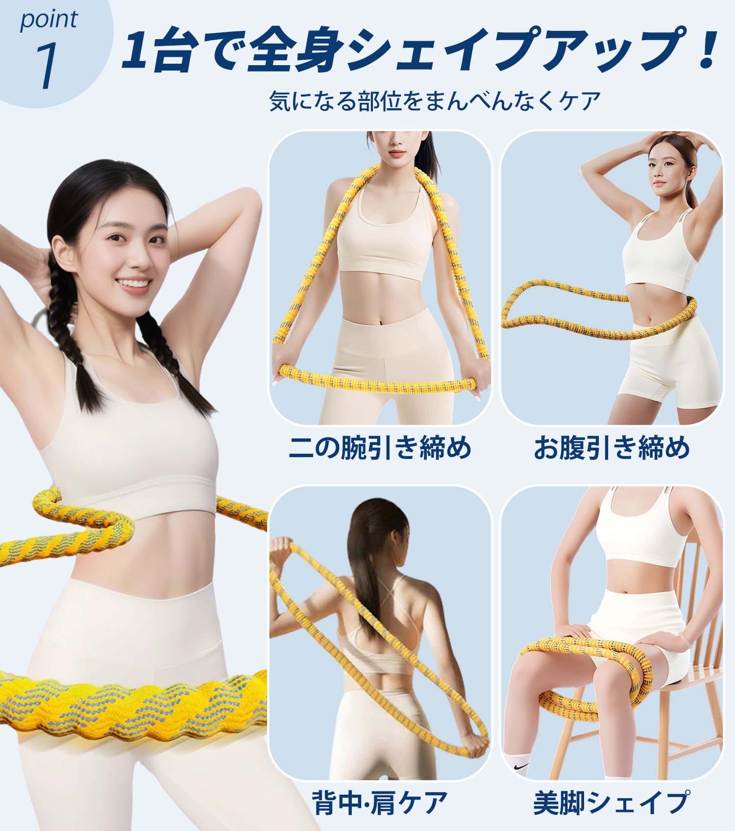 キーワード:フラフープ、くびれ、脂肪燃焼、自宅エクササイズ、静音、収納便利、家族共用、スムーズ回転、Soft素材、10分運動