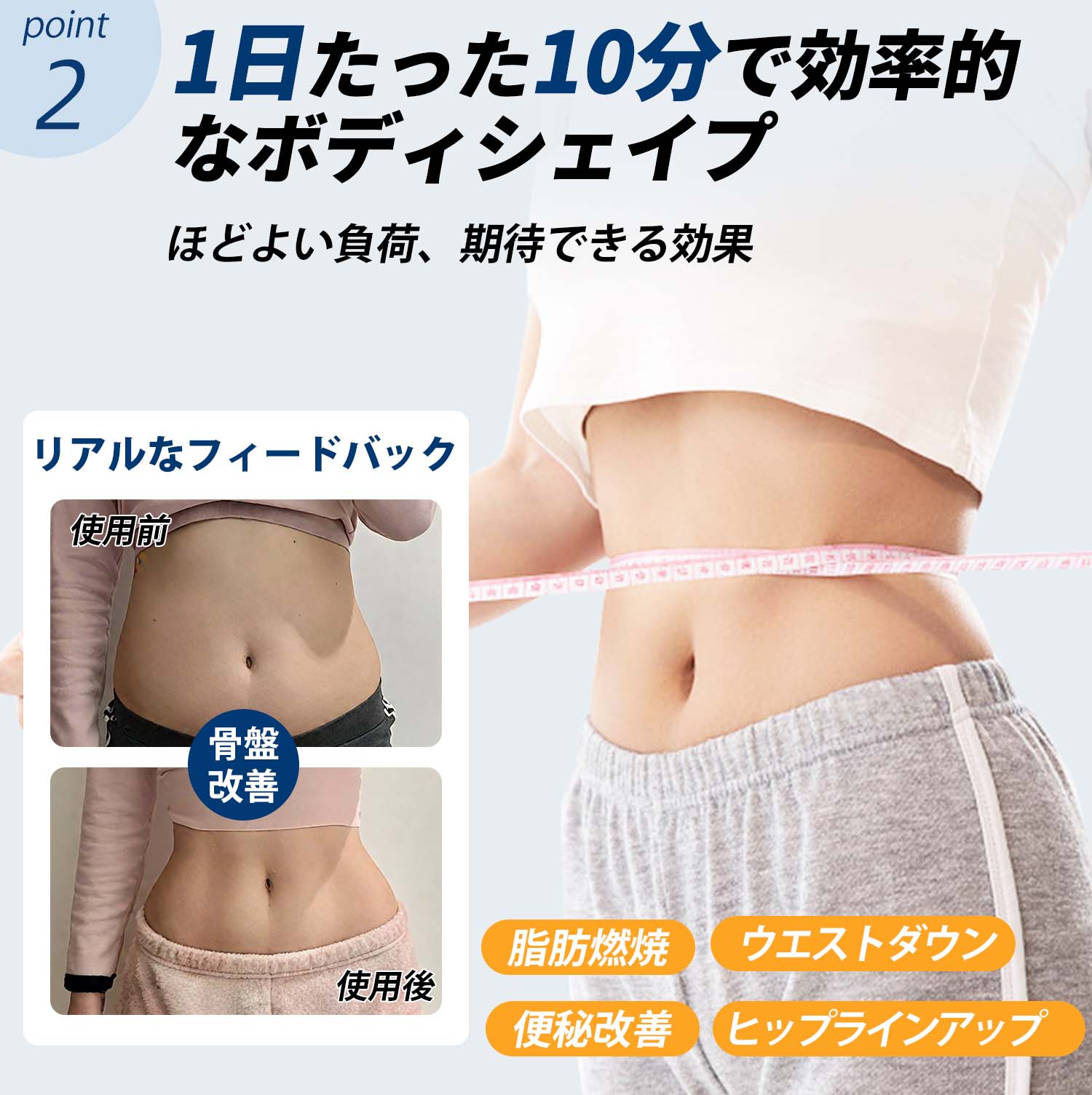 メリット:痛くない、続けやすい、全身シェイプ、場所を取らない、安心設計、お手入れ簡単、姿勢改善、代謝アップ