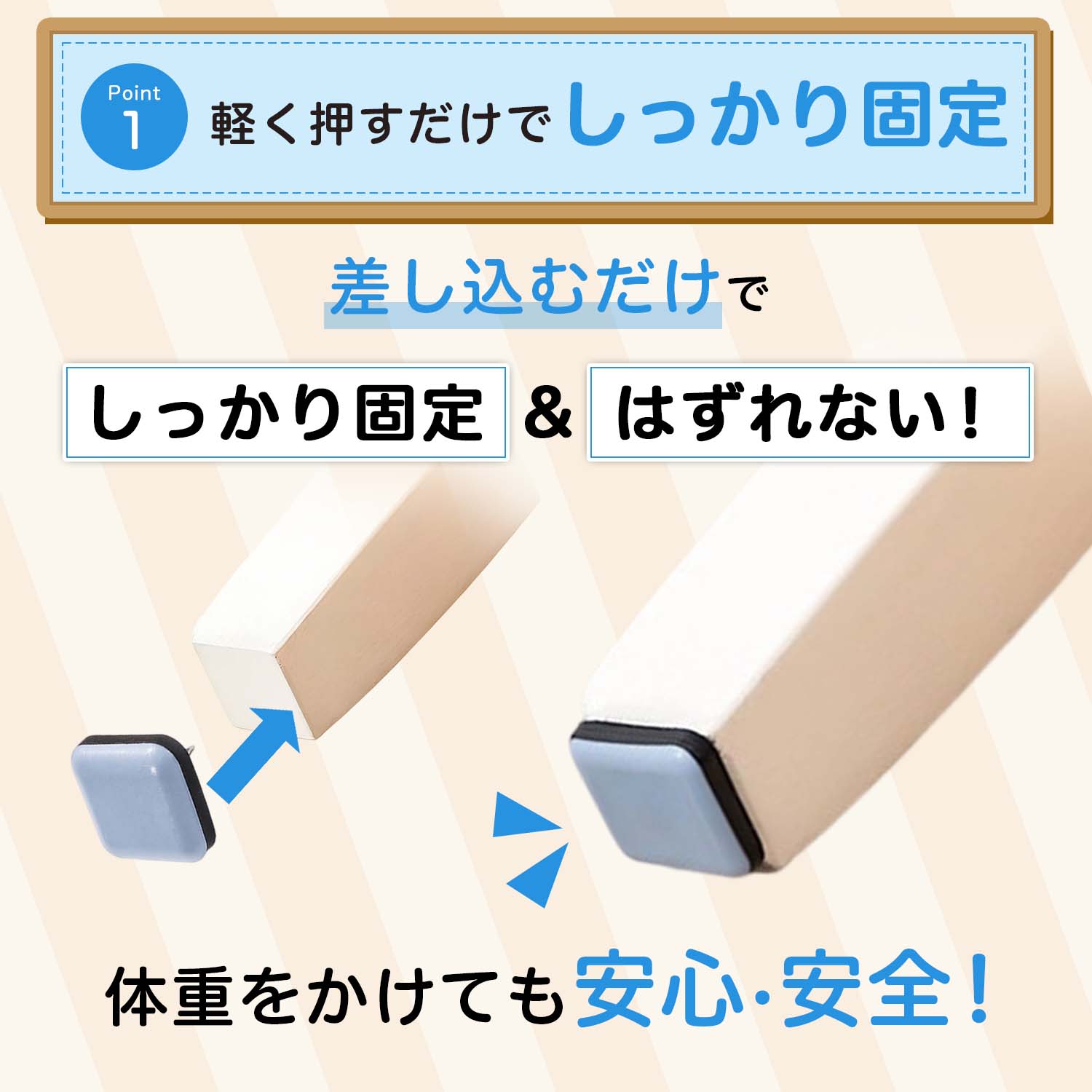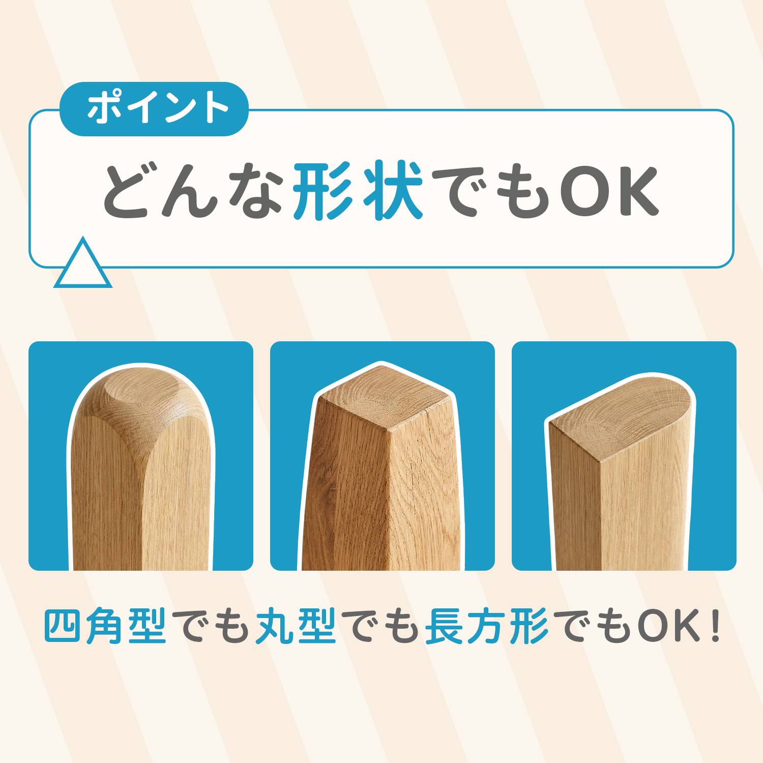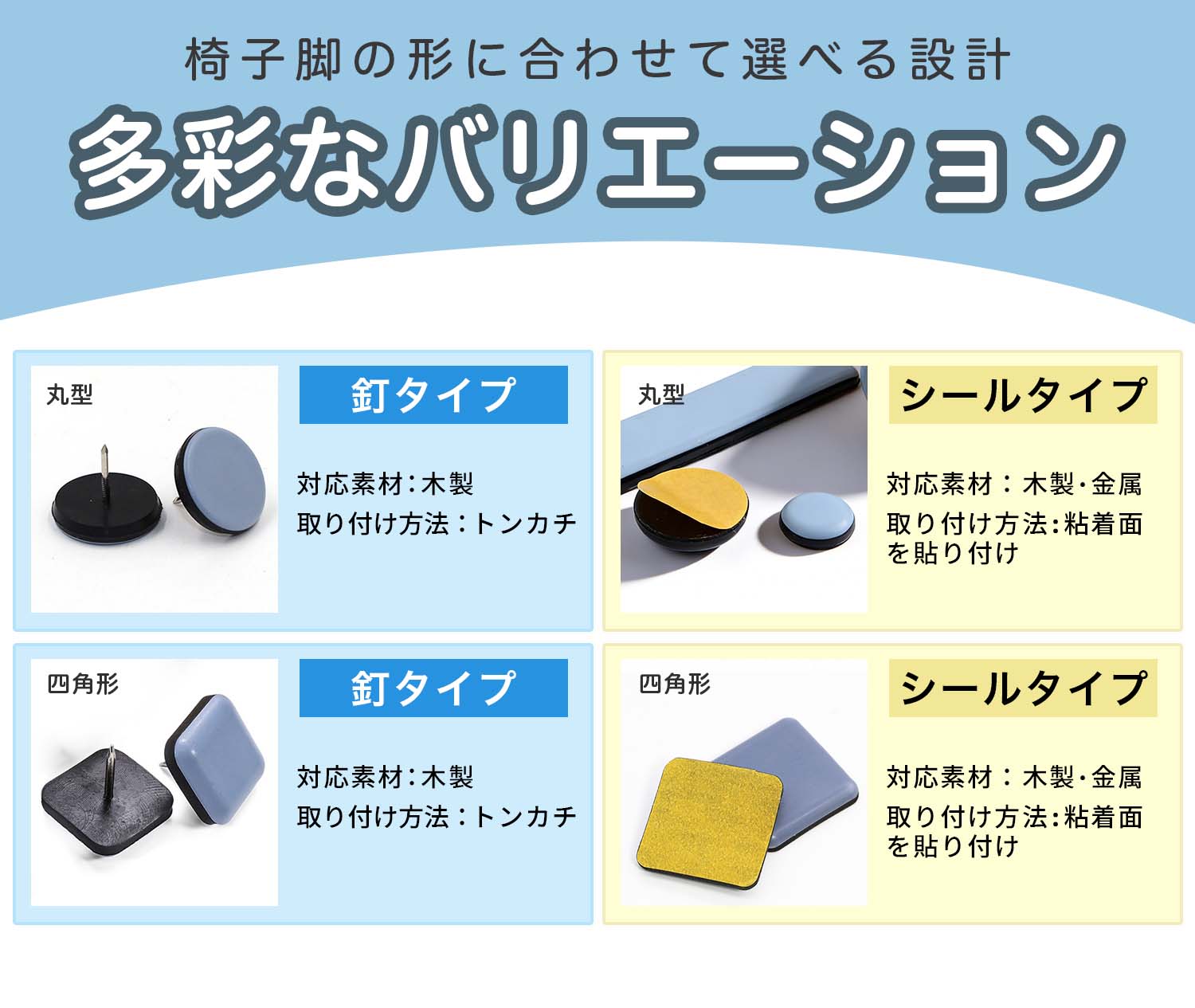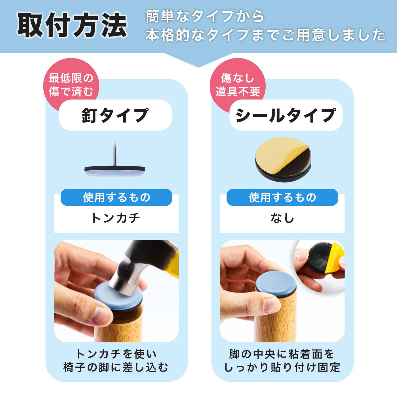 貼るだけの【粘着式】、釘で打ち込む【釘式】、ネジで締める【ネジ式】。あなたのライフスタイルやイスの素材に合わせて選べます。