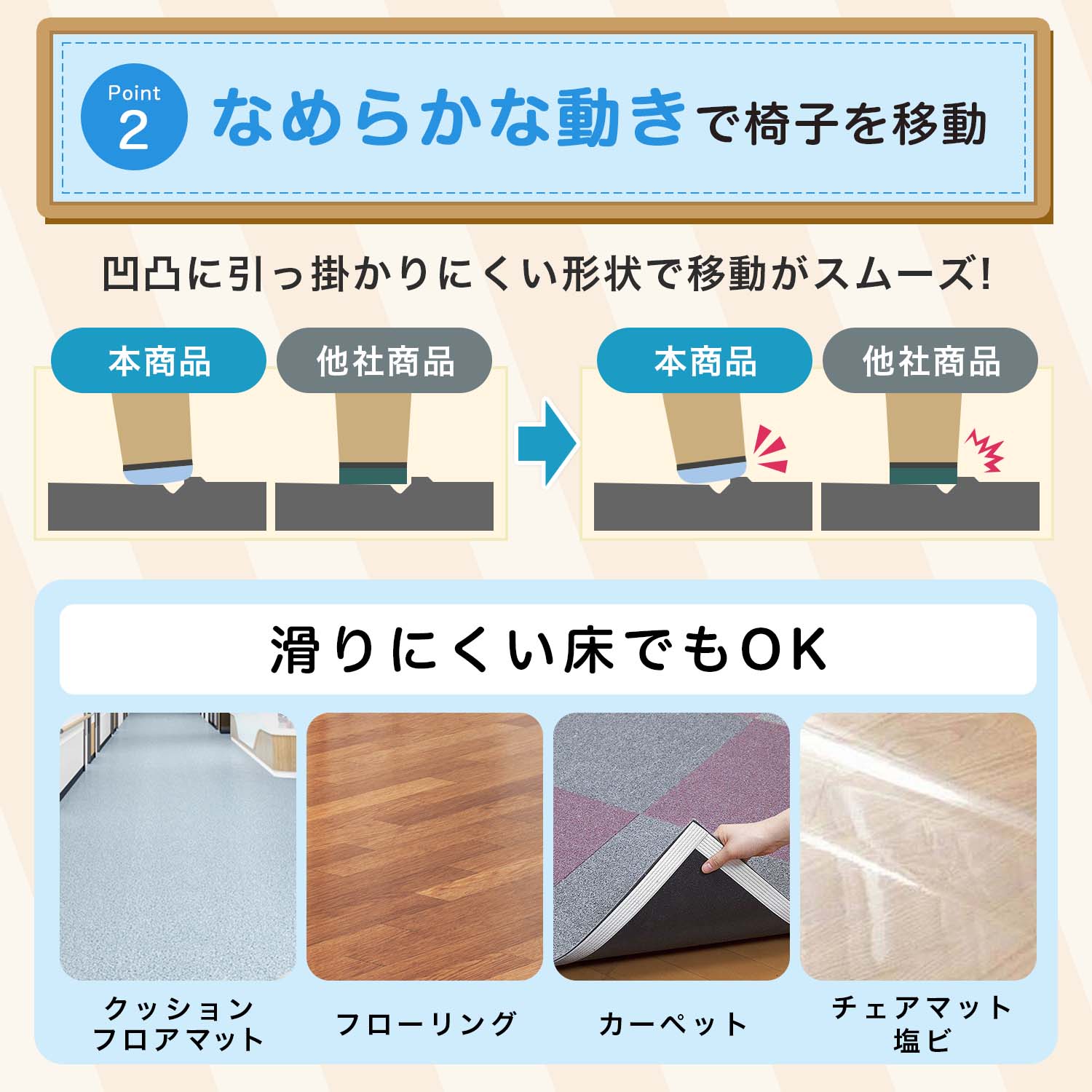 イスを引くときの「ギーッ」という不快な音ともサヨナラ!フッ素加工だからこそ実現した低摩擦設計。フローリングやカーペットでも驚くほど軽いタッチで動かせます。