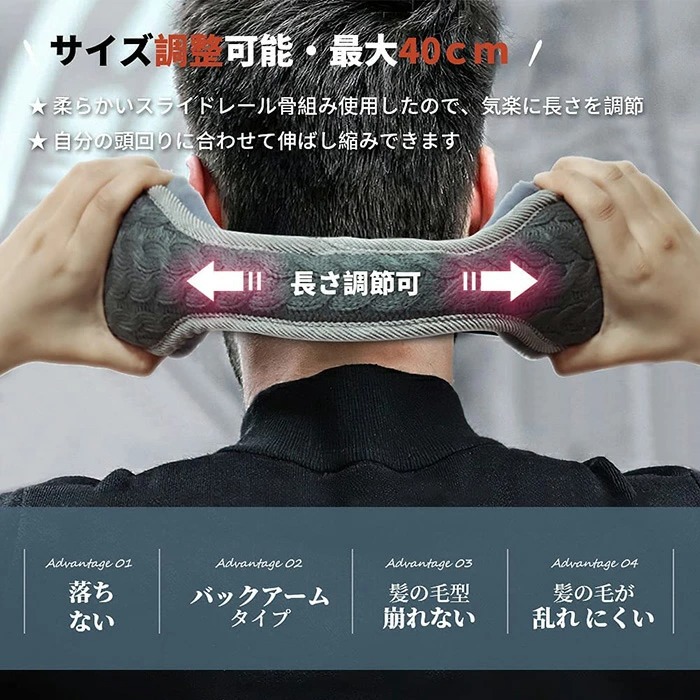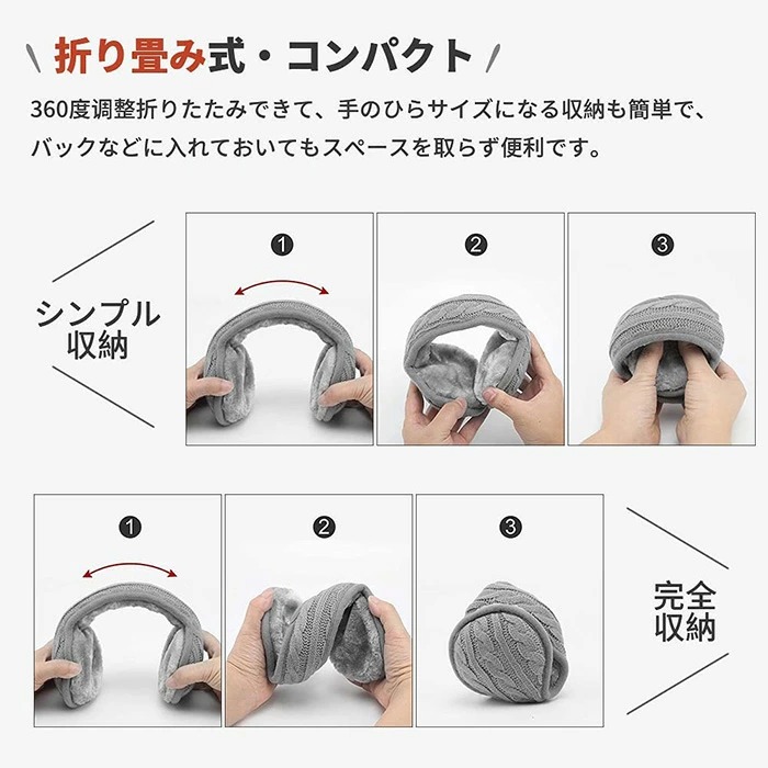 寒い季節に最適な折りたたみ式イヤーマフ。やわらかなファー素材が耳を包み、保温性抜群。伸縮レールで最大約40cmまで調整可能。コンパクトに折りたため、かばんやポケットにもすっきり収納できます。髪型を気にせず使えるバックアームタイプで、おしゃれに防寒ができます。