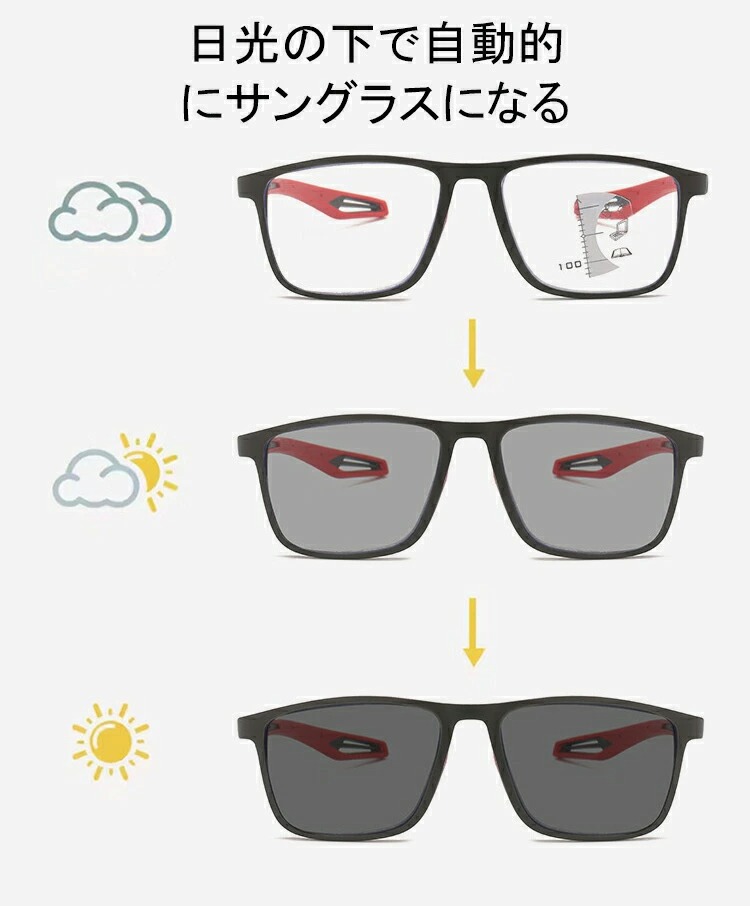 ・紫外線感知で自動色変化。室内では透明、屋外ではサングラスとして使用可能。