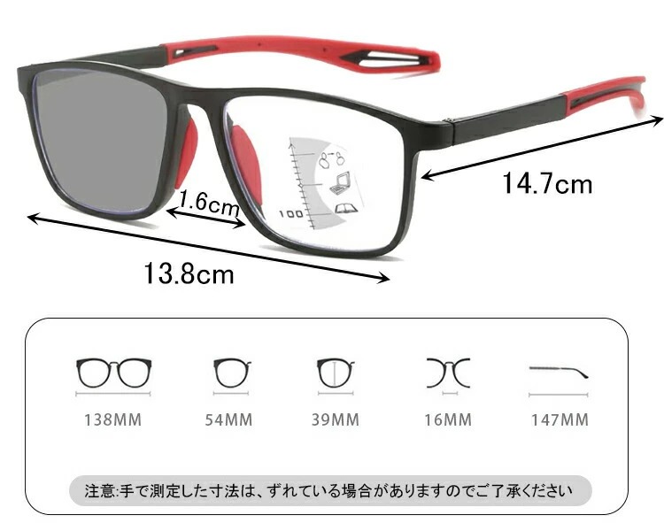 レンズ幅:一三八mm 鼻幅:一六mm テンプル長:一四七mm レンズ高さ:三九mm フレーム幅:五四mm