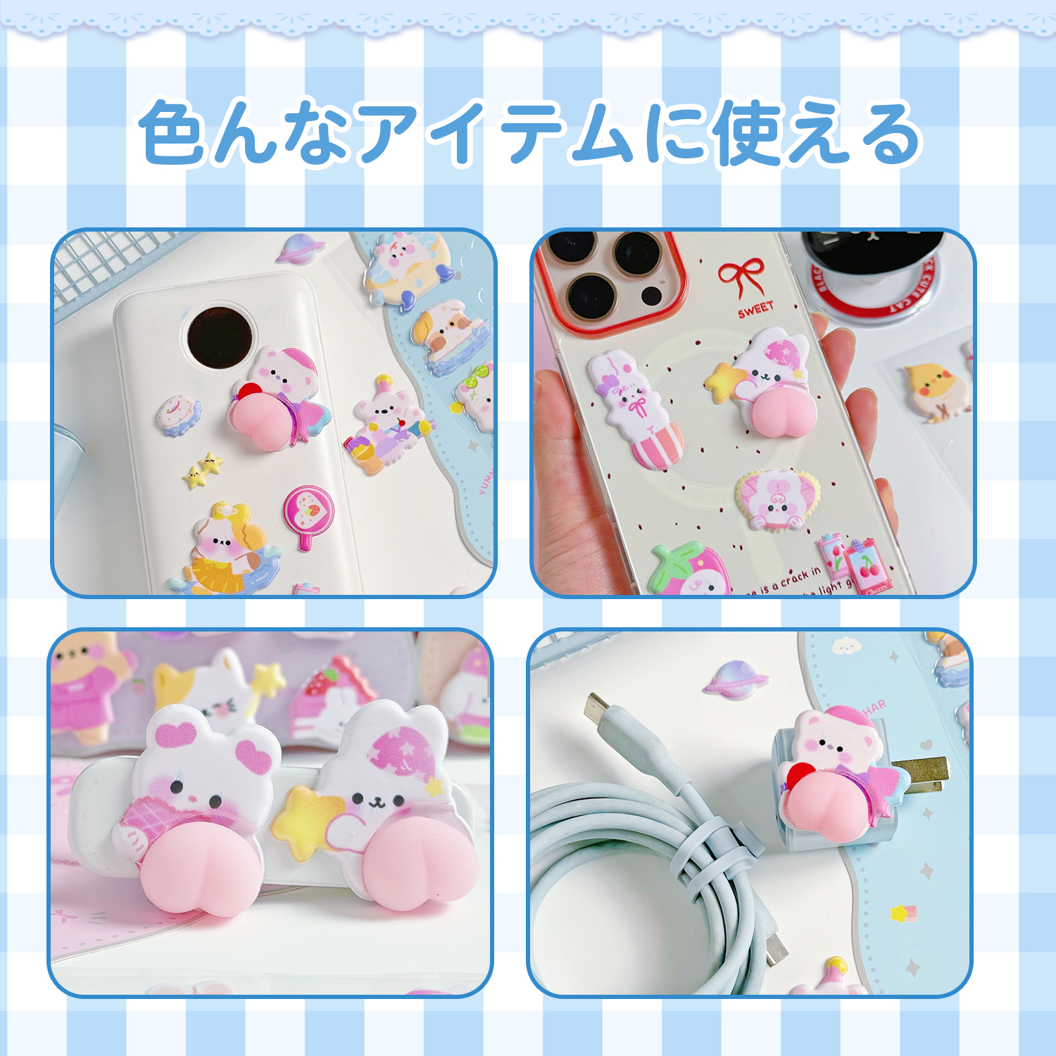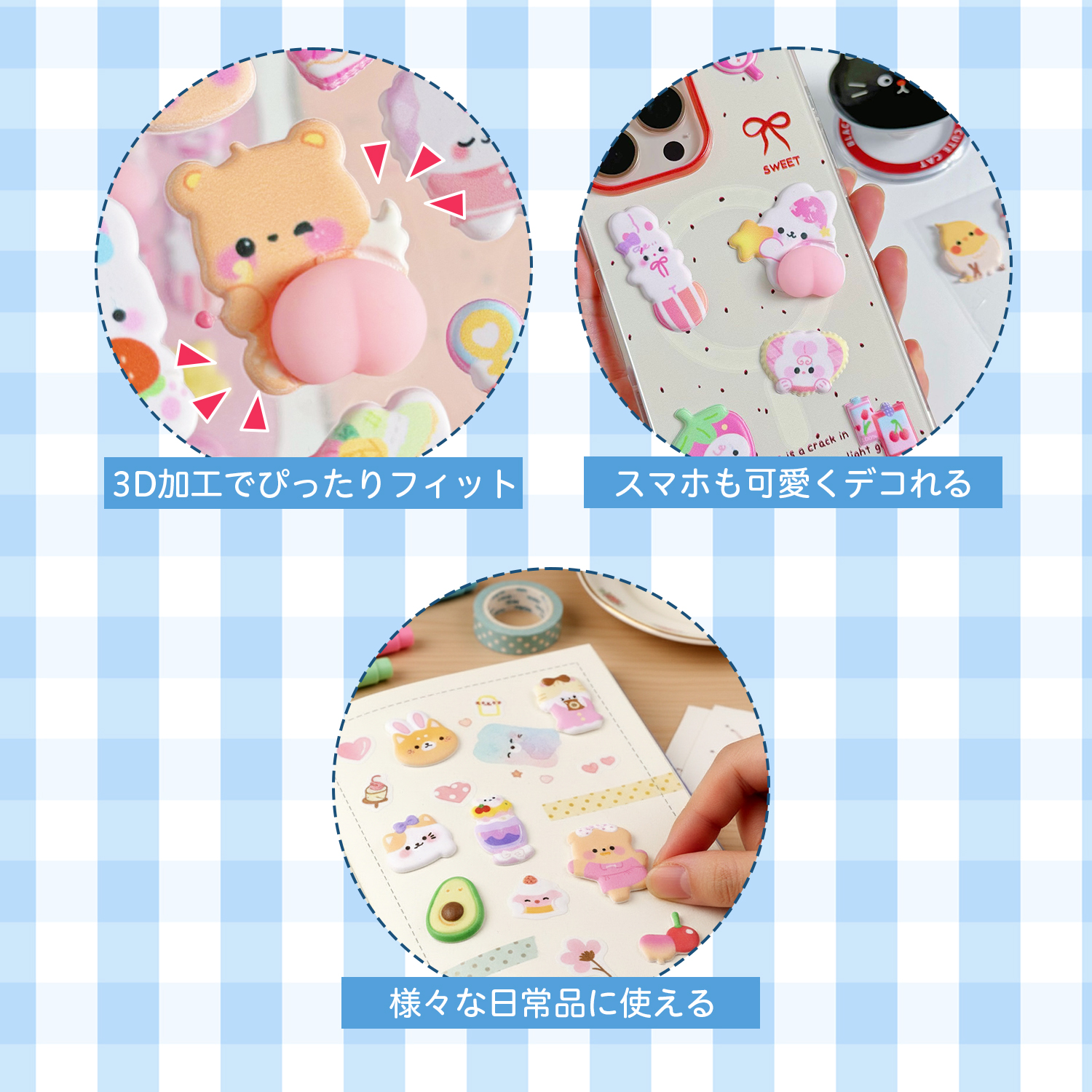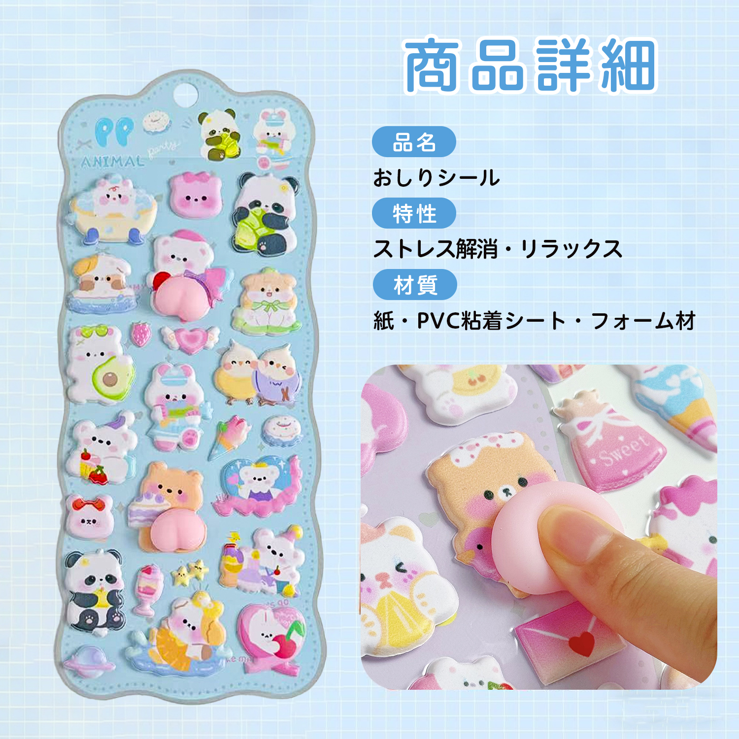 毎日が楽しくなる「おしりシール」シリーズ。立体加工によるふっくら質感が魅力で、癒しアイテムとして人気。