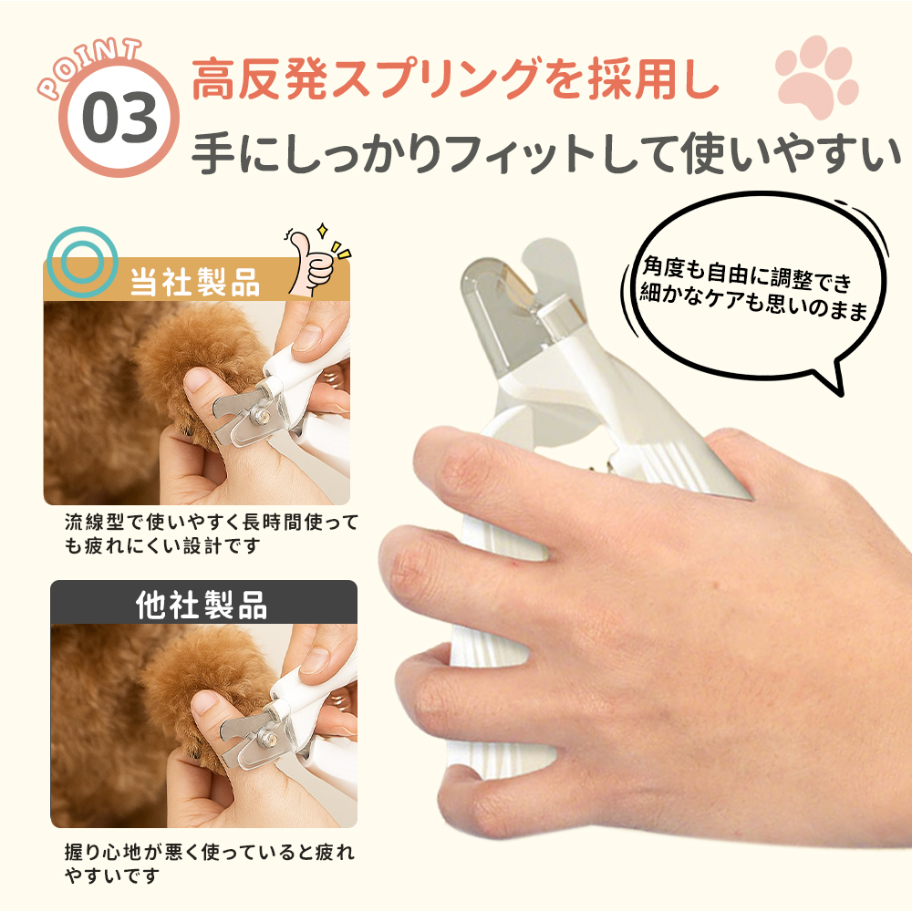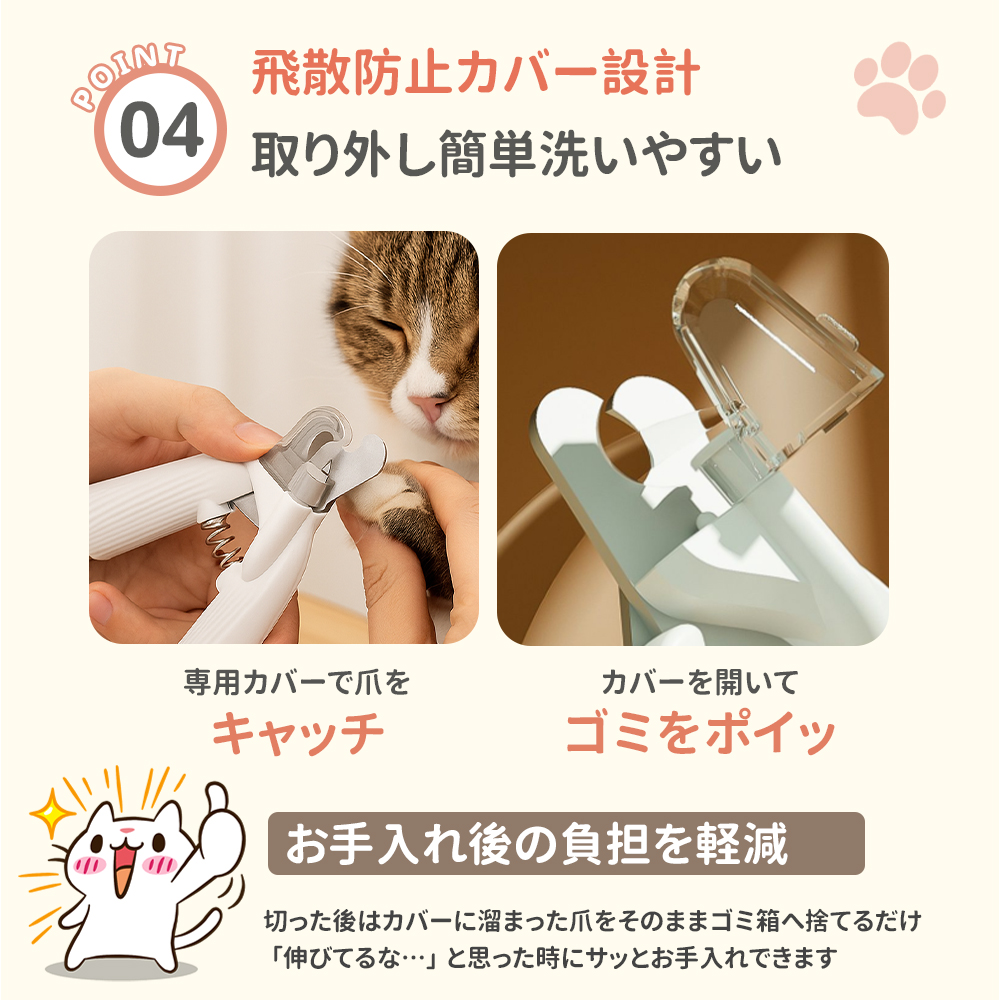 ●【爪やすり付き】底部に内蔵されたやすりでカット後の仕上げも簡単。爪をなめらかに整え、家具などの傷防止にも。