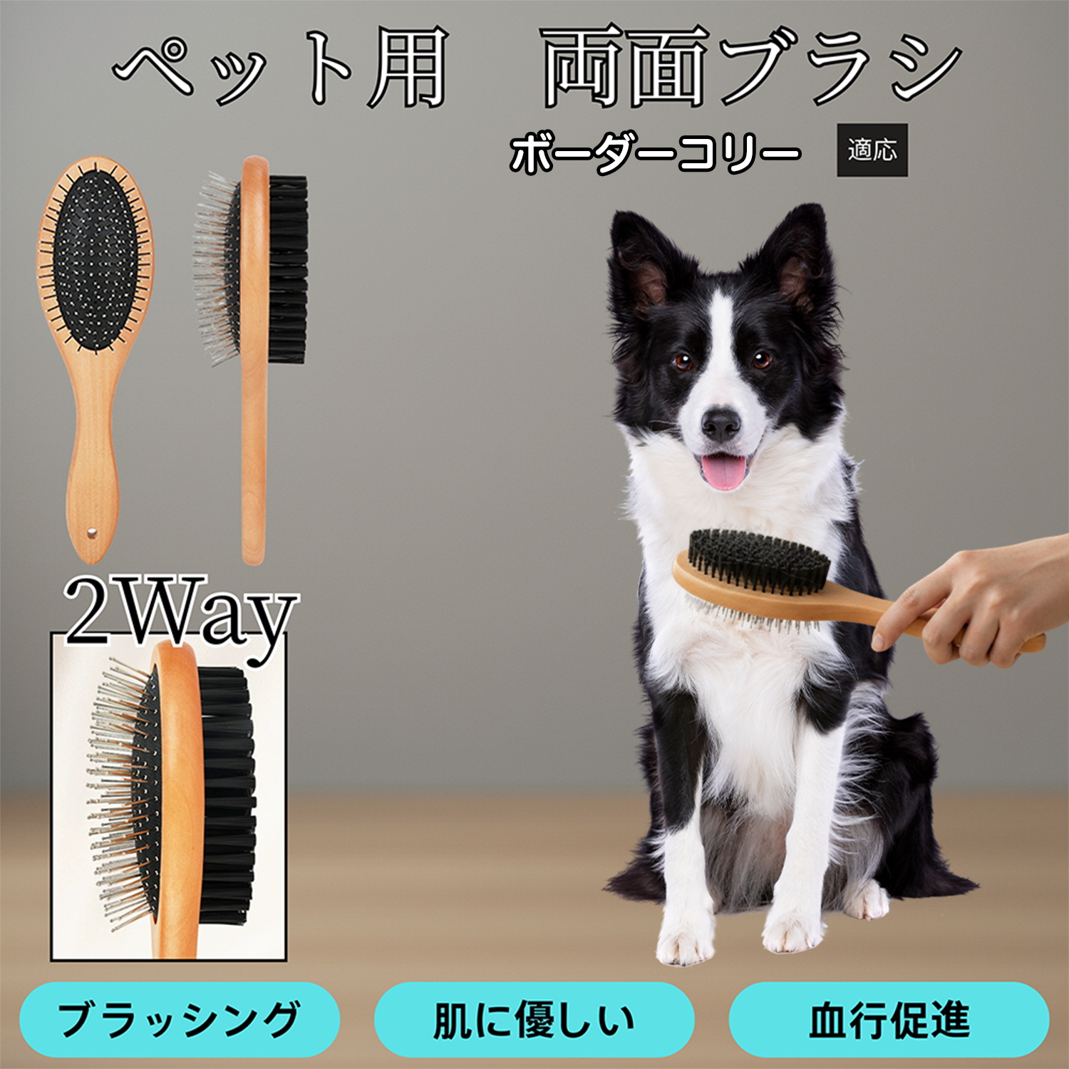 木製ペット両面ブラシ 犬猫用 グルーミング スリッカー コーム 抜け毛取り 皮膚ケア 毛並みを整える ボーダーコリー犬 ボーダー