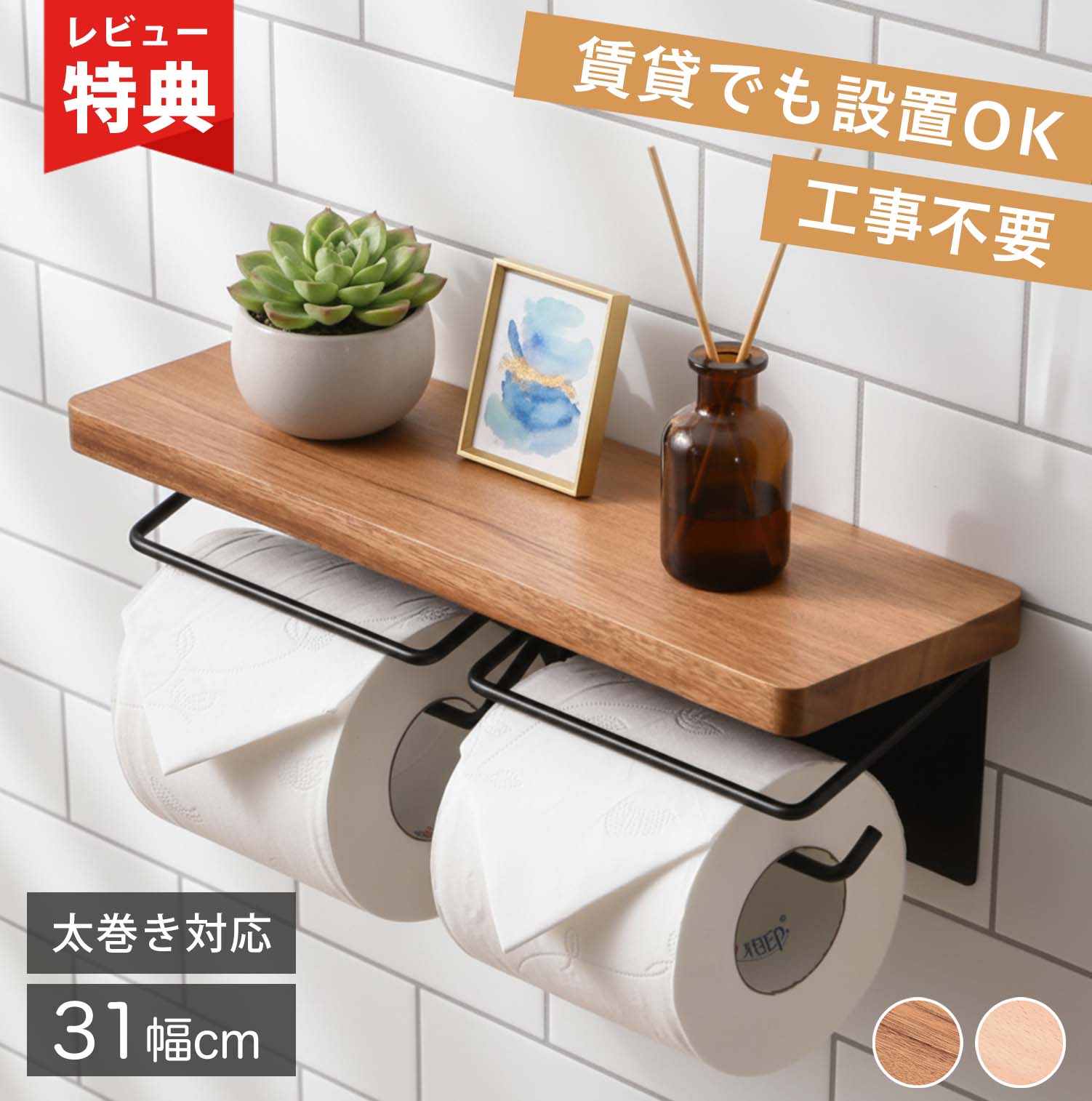 トイレットペーパーホルダー おしゃれ 2連 天然木 木製 ダブル アイアン ヴィンテージ 空間 トイレ収納 棚付 賃貸 スチール